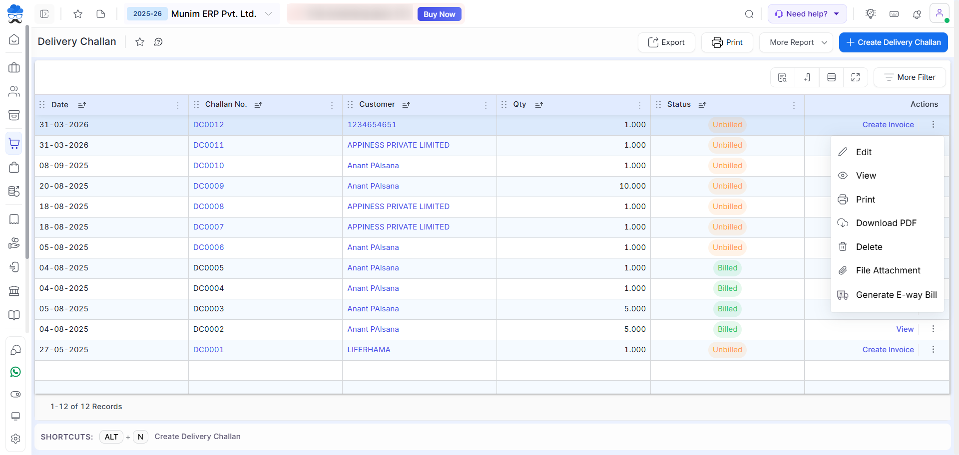 | Create Delivery Challan | Click this button to create a new Delivery challan. |