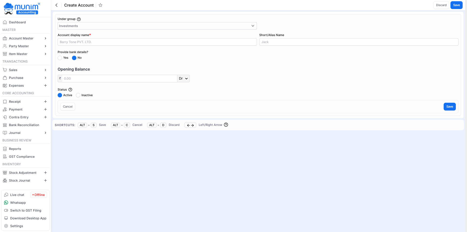 | Is Active? | Here if you select “Yes” then this account is shown in all modules and if you select “No” then this account is not shown in all modules. |