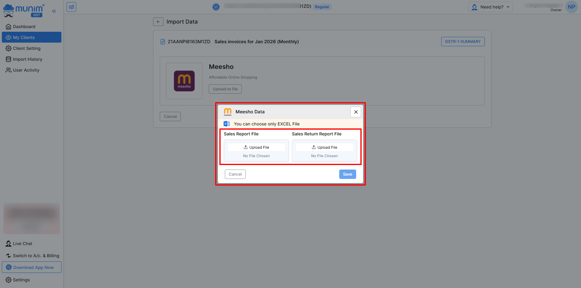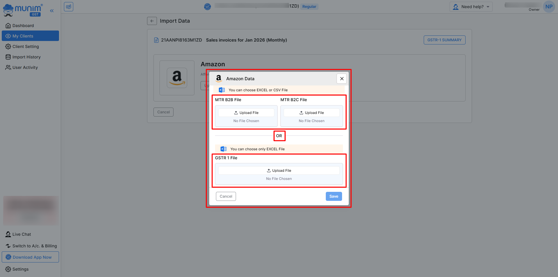 • Once you open the template, Munim displays the currently selected GSTIN and the filing period