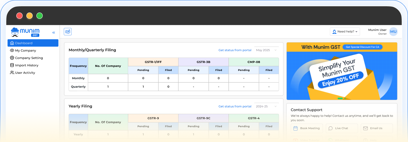 Reduce errors and save time on GST compliance. Munim GST Return Filing software helps you calculate, manage records,