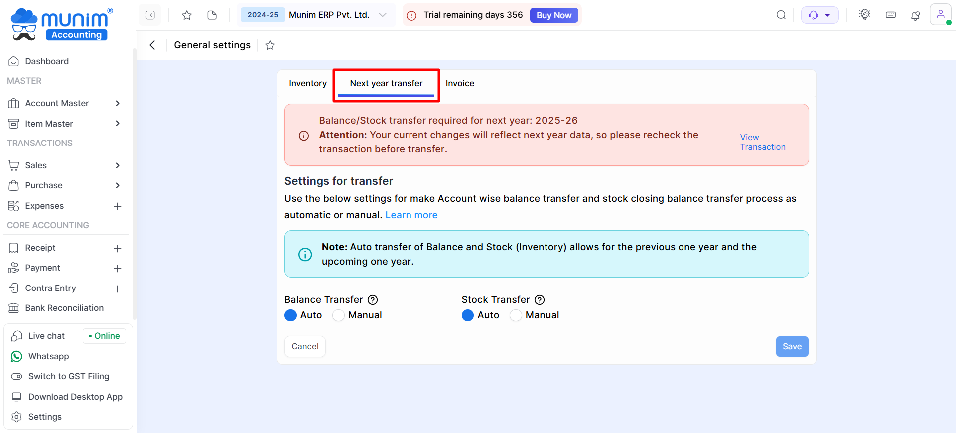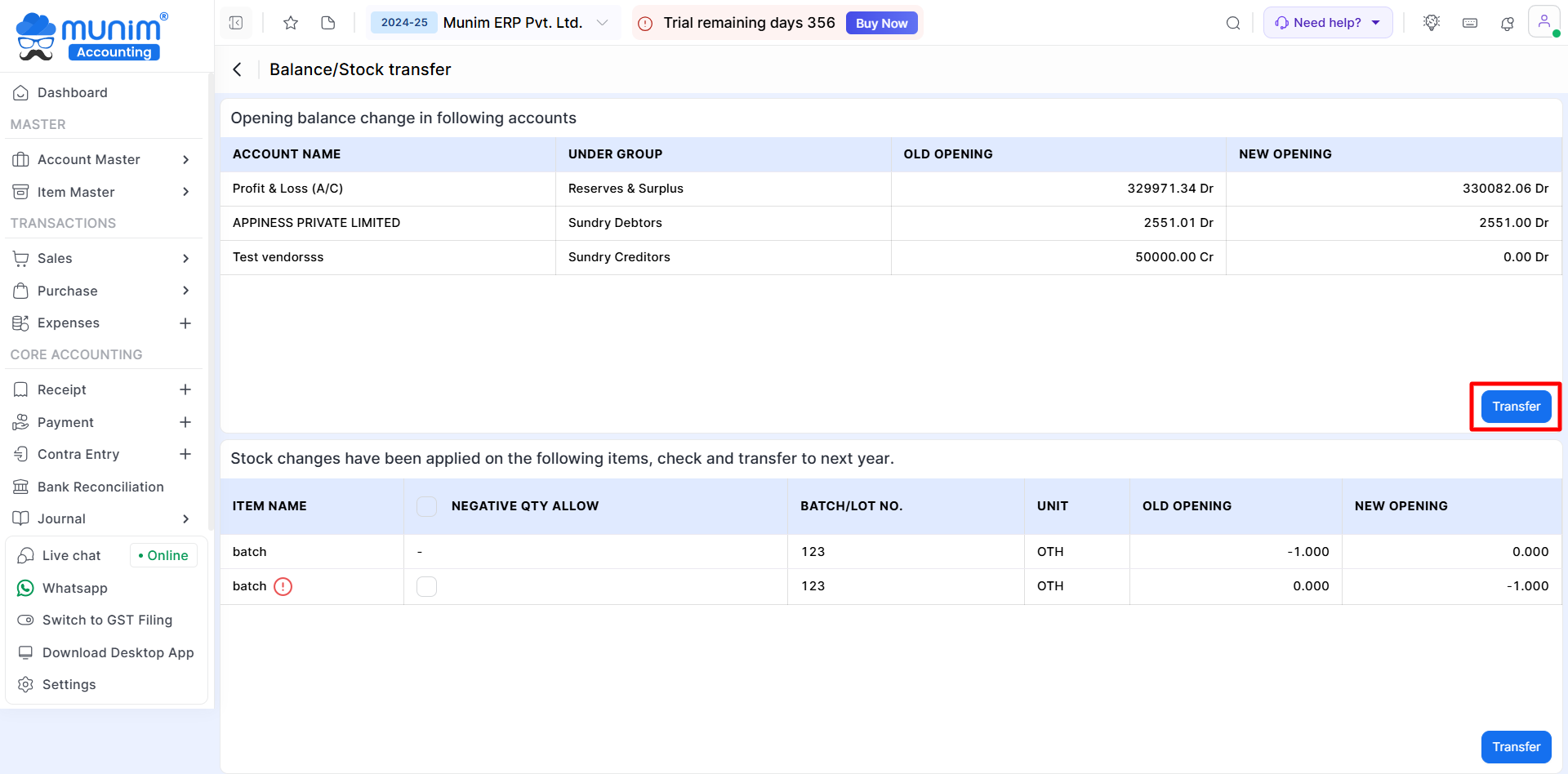 Note: If you make any changes in your previous year’s transaction entry, then a popup will be shown with 2 buttons i.e Cancel and Transfer. On clicking the Transfer button, your current changes will be updated in your next year’s data.