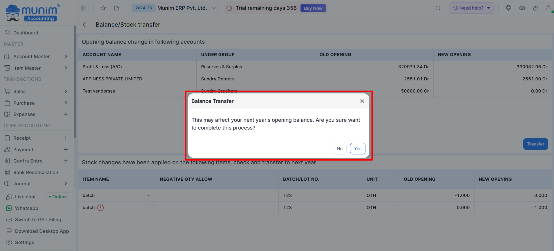 - Step 3: After clicking on the “Transfer” button a confirmation pop-up will be displayed asking you whether you want to transfer the data or not. Clicking on the Yes button will transfer all your data to the next year.