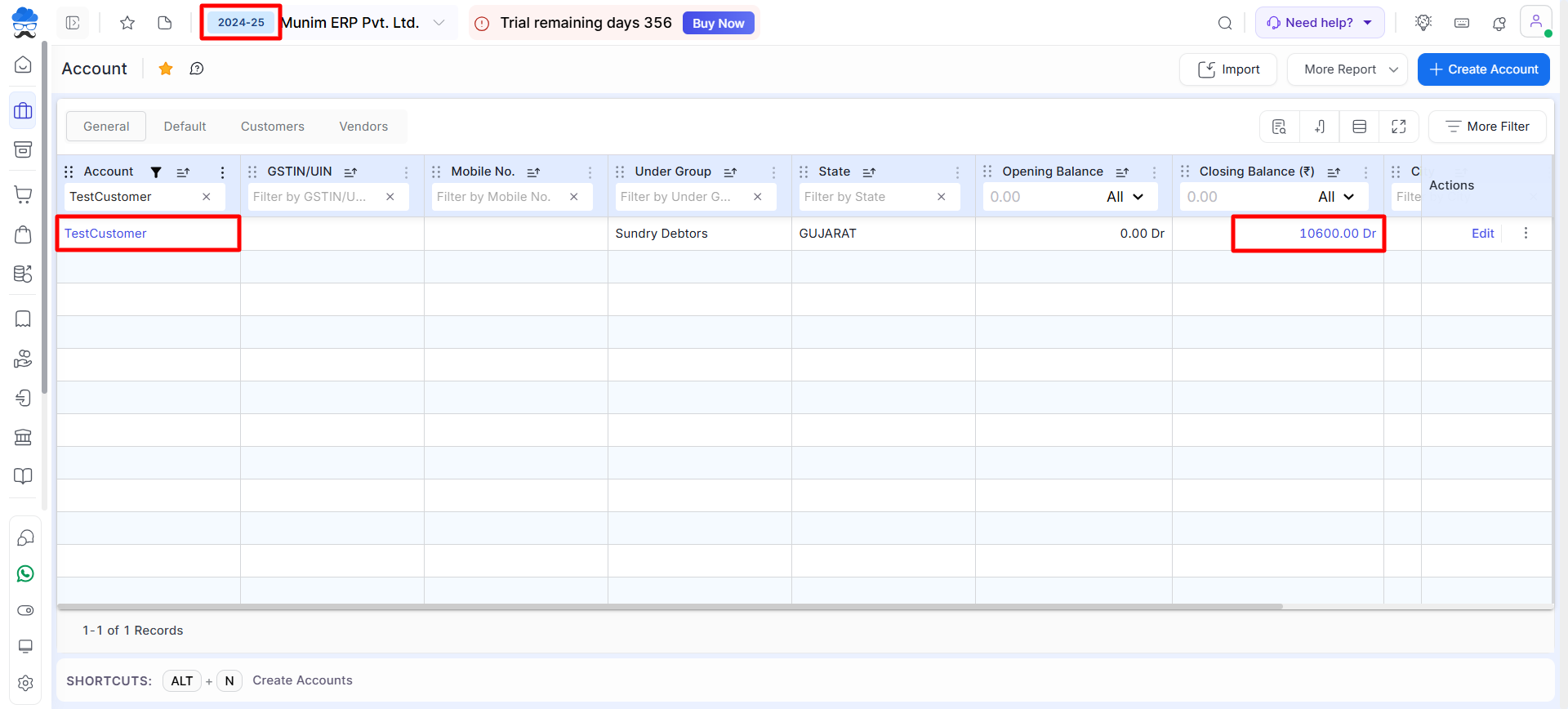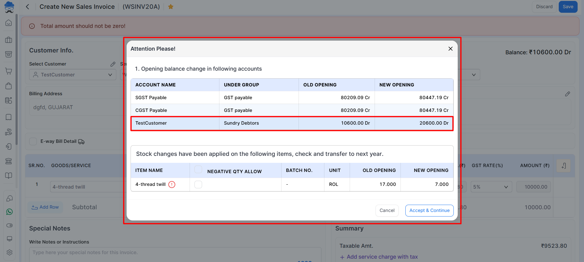 - Step 3: Create a new sale invoice for the Anant Fashion account and save the invoice to show the pop-up for Balance Transfer. Click on the Transfer button to update changes in next year’s data.