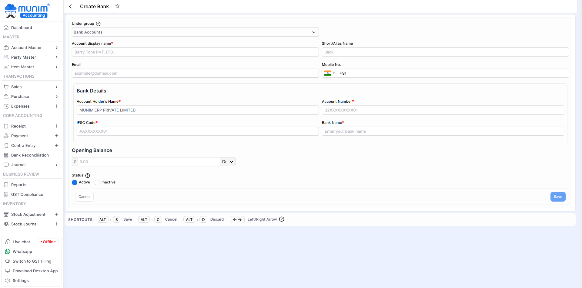 In the ledger module, you can add your Bank Accounts ledger to Munim.