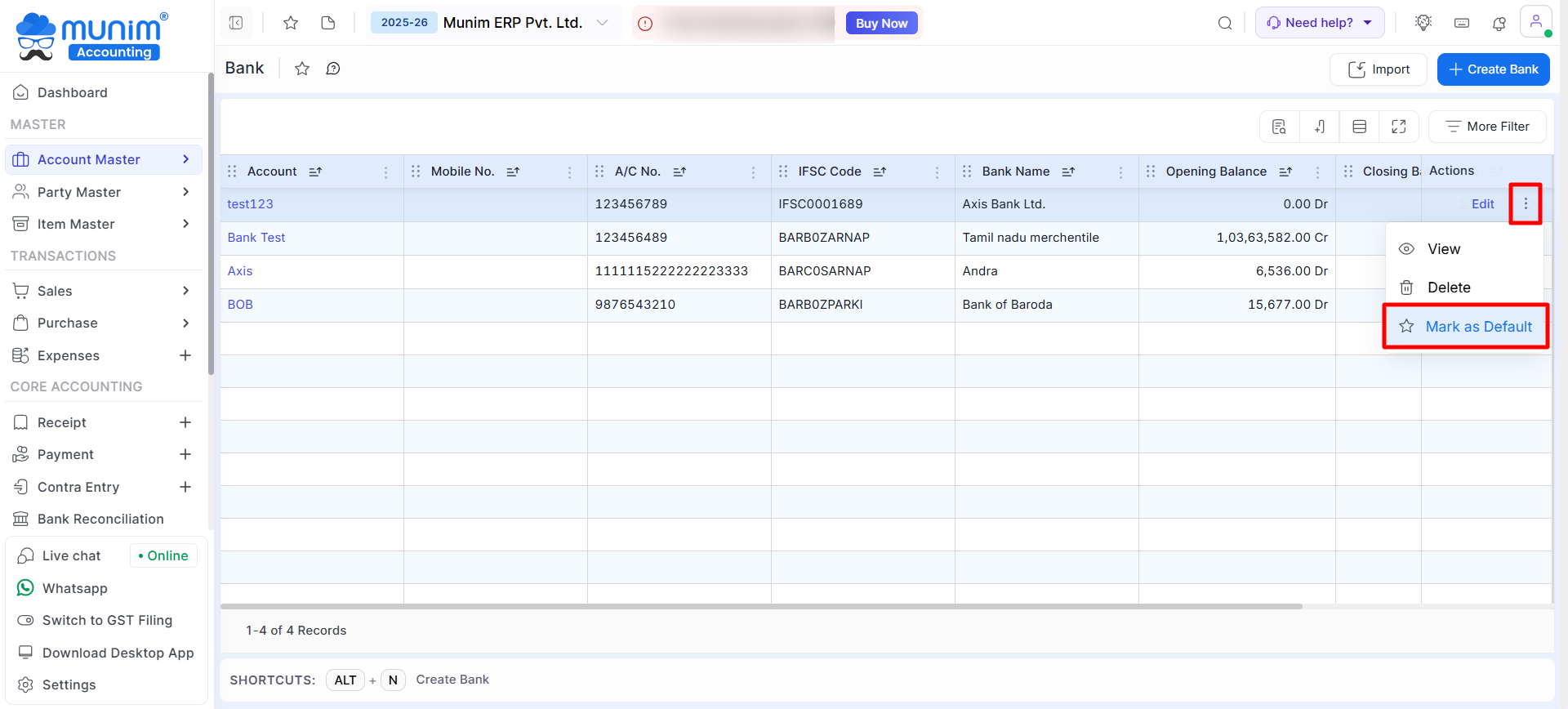 - Navigate to the Bank module in the Account Master module following the creation of bank accounts.