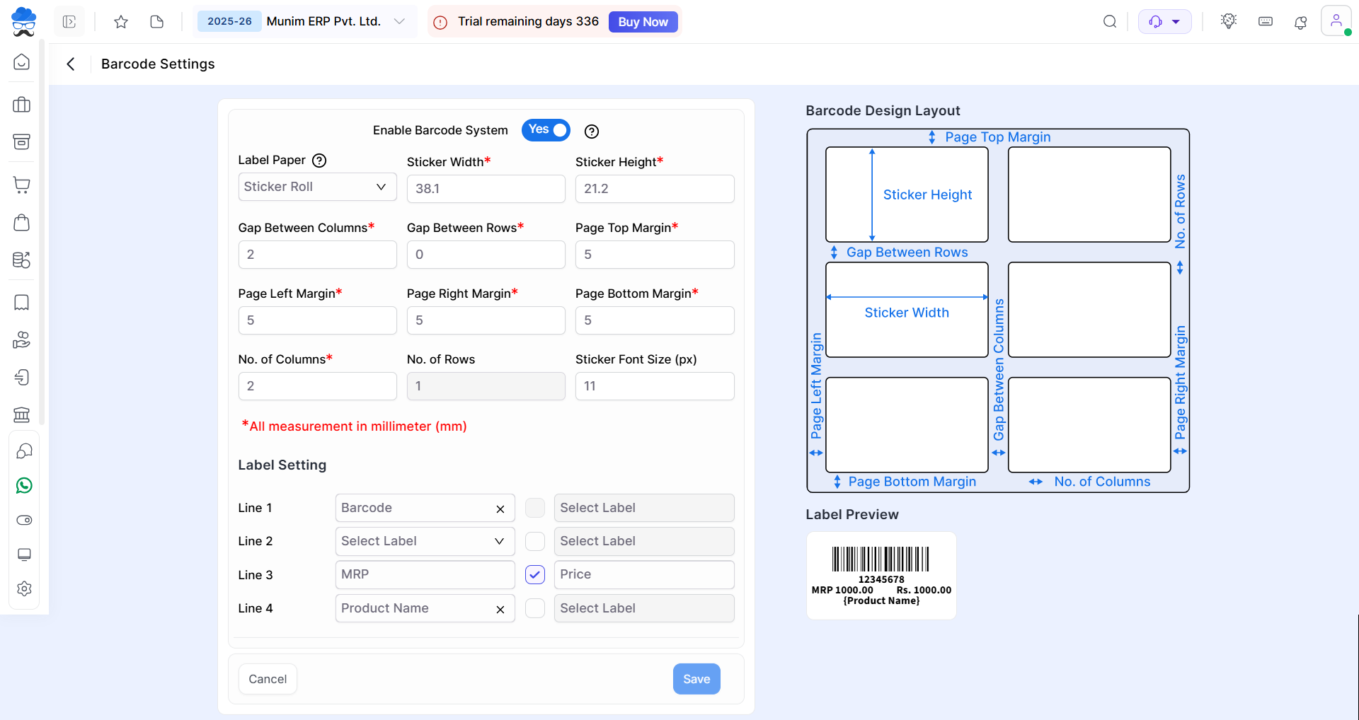 - Now click on the toggle button to Yes to Start the Barcode System.