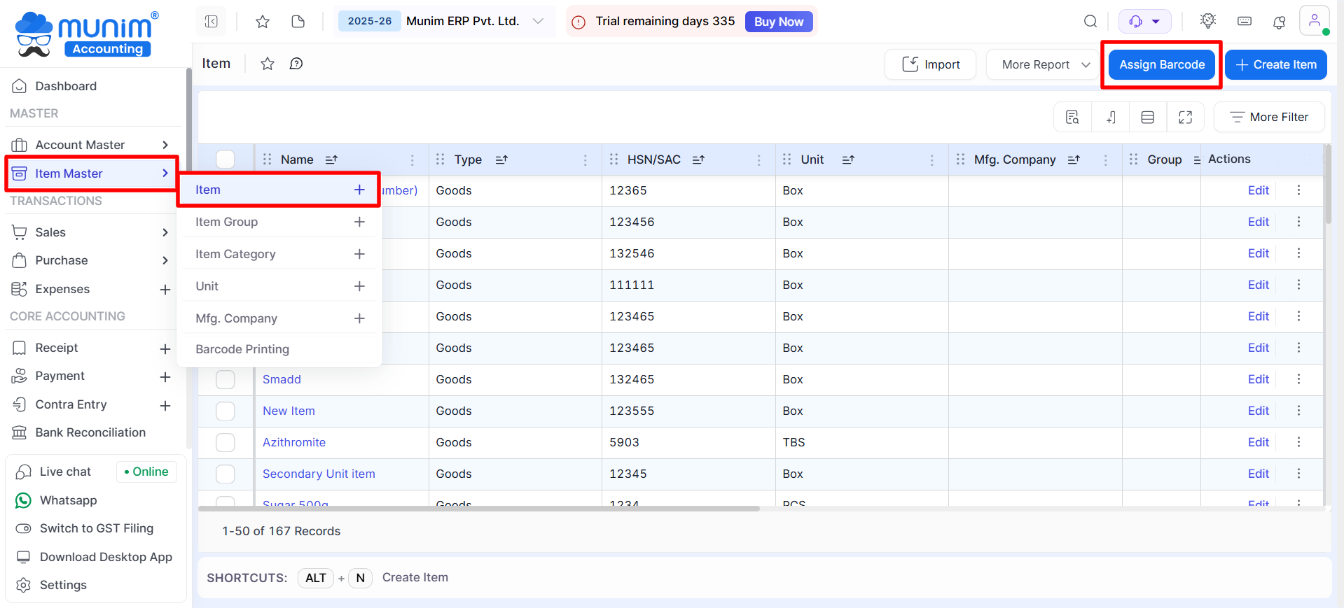 - Go to the Item Master module and click the Barcode Printing option on the left menu.