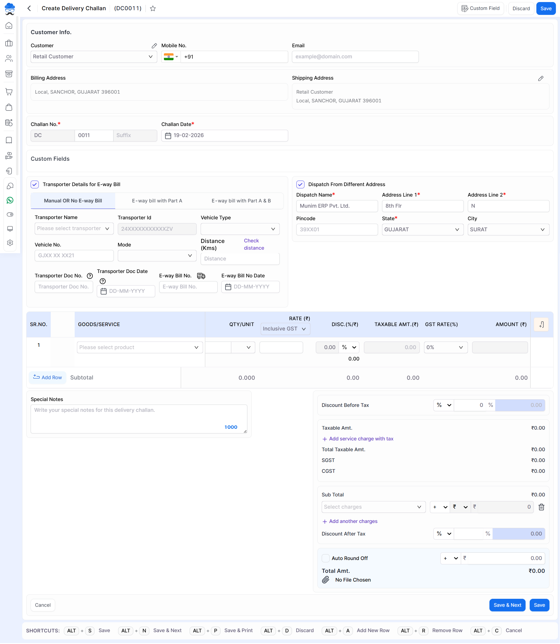 - Click on the Create delivery challan button or press Alt+N key.