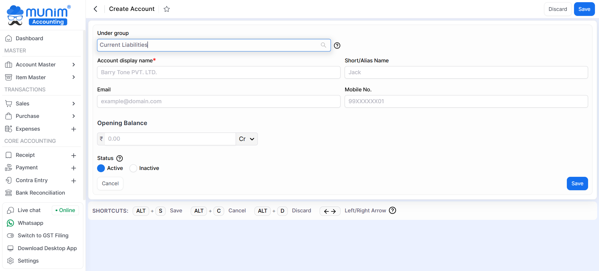 Is Active?Here if you select “Yes” then this account is shown in all modules and if you select “No” then this account is not shown in all modules.