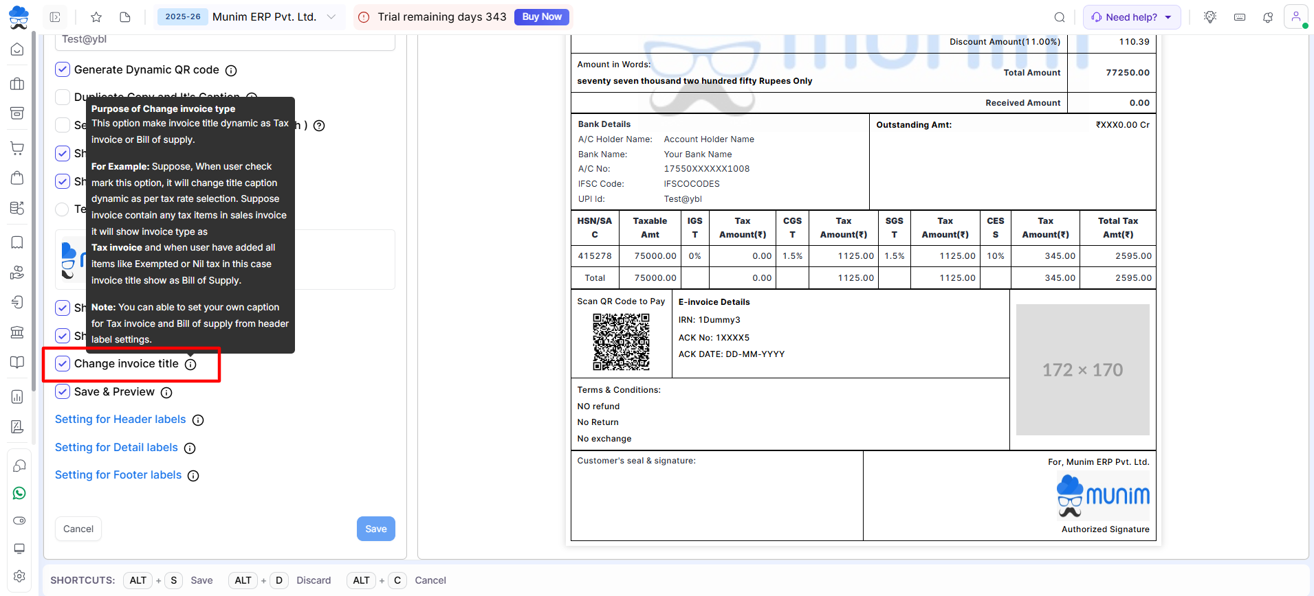 - You can customize the captions for “Tax Invoice” and “Bill of Supply” through the header label settings, allowing for flexibility in your invoice presentation.