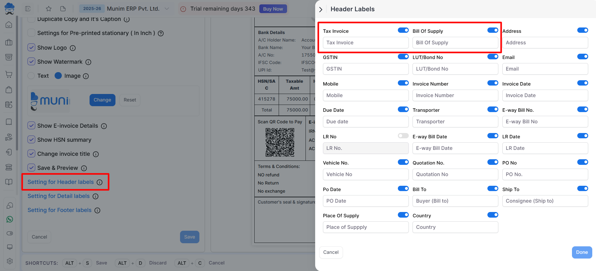 - You can customize the captions for “Tax Invoice” and “Bill of Supply” through the header label settings, allowing for flexibility in your invoice presentation.