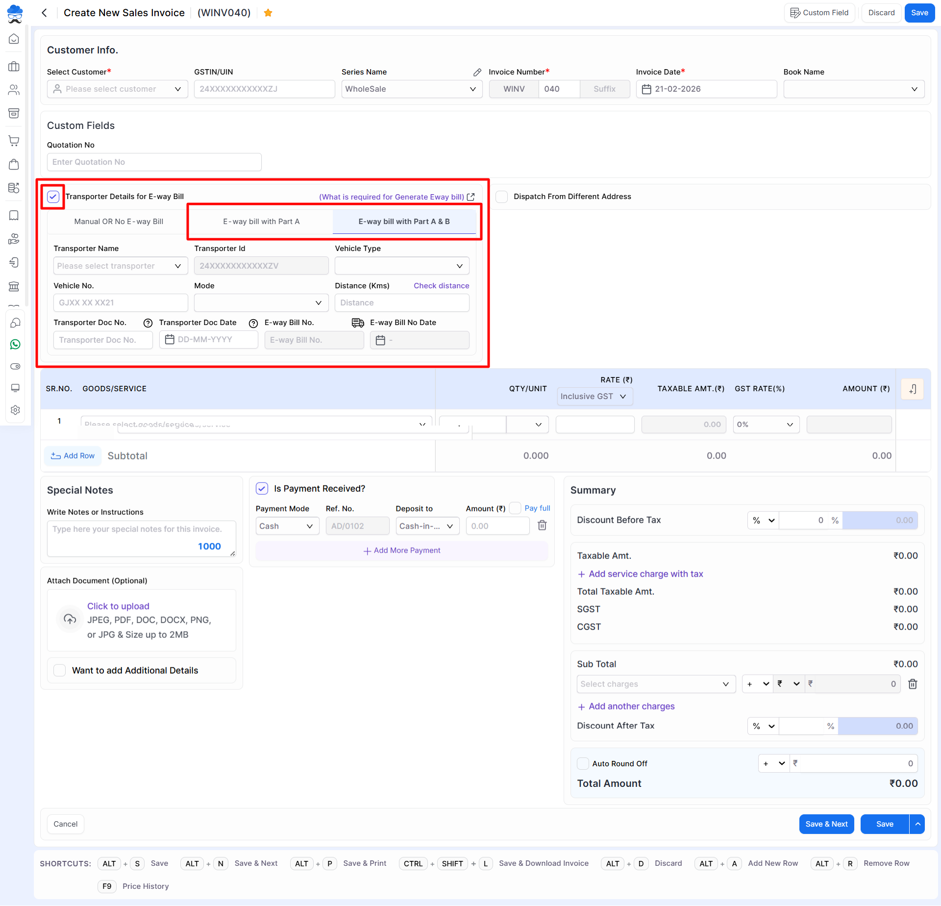 - Create an invoice by inputting the required data and adding the E-way Bill details in Part A or Part A & B section to generate the E-way bill.