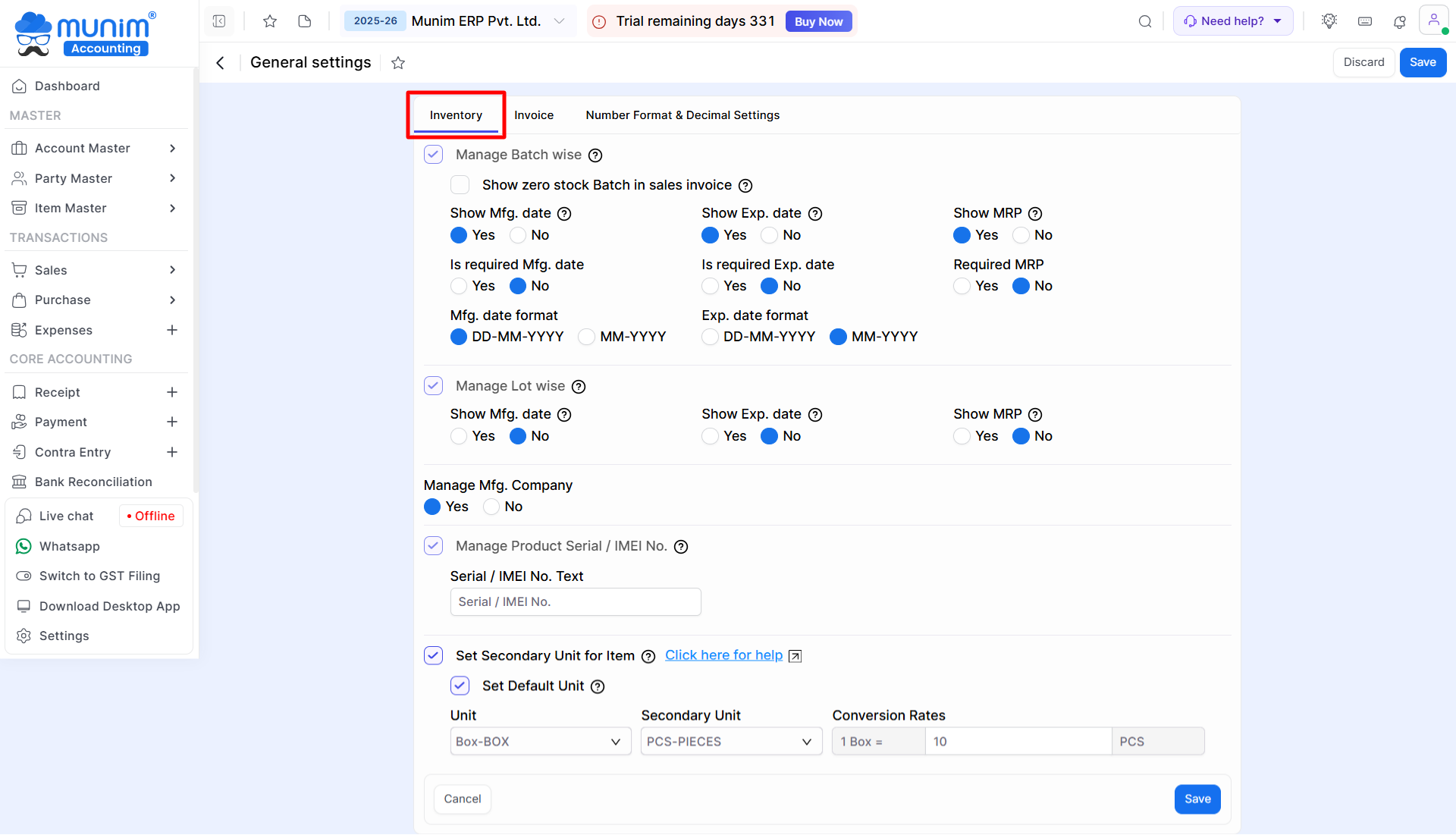 This module is helpful for Inventory setting management, and Next year’s transfer data management. On this page, the user is able to change the settings for batch-wise manage item, lot-wise manage item, and mfg. company and next year’s transfer data.