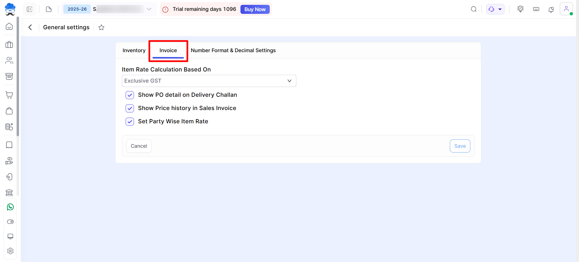 Decimal places for Rate: This option allows for the specification of the required decimal places for the Item Rate value.