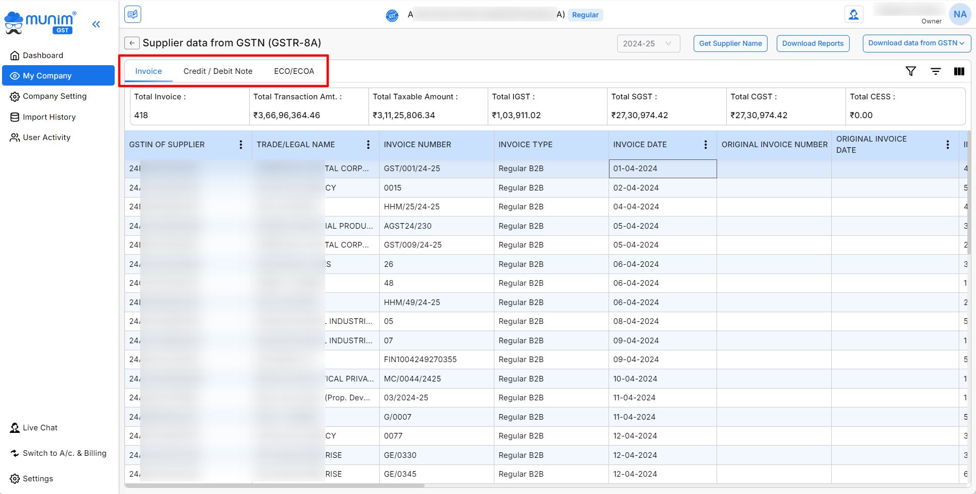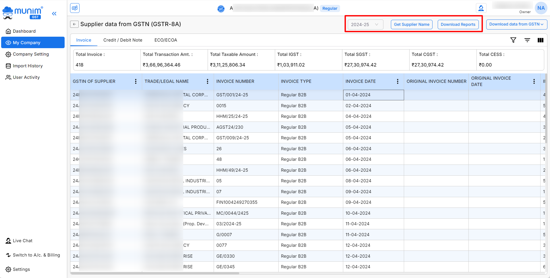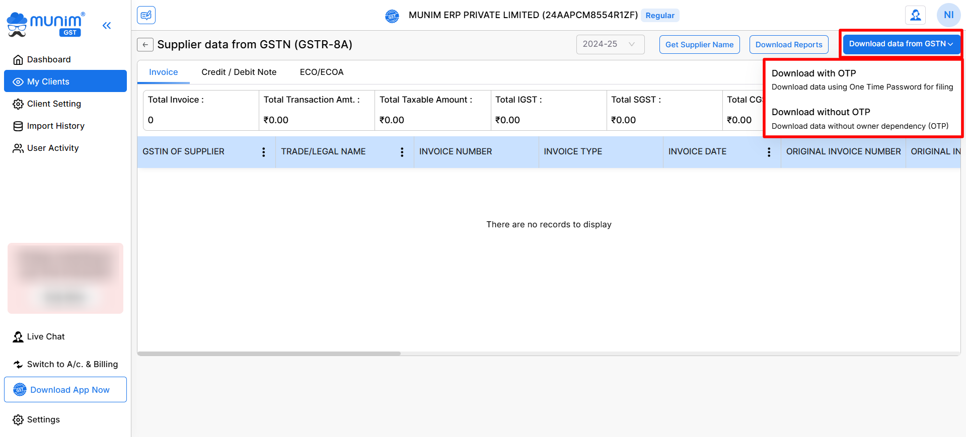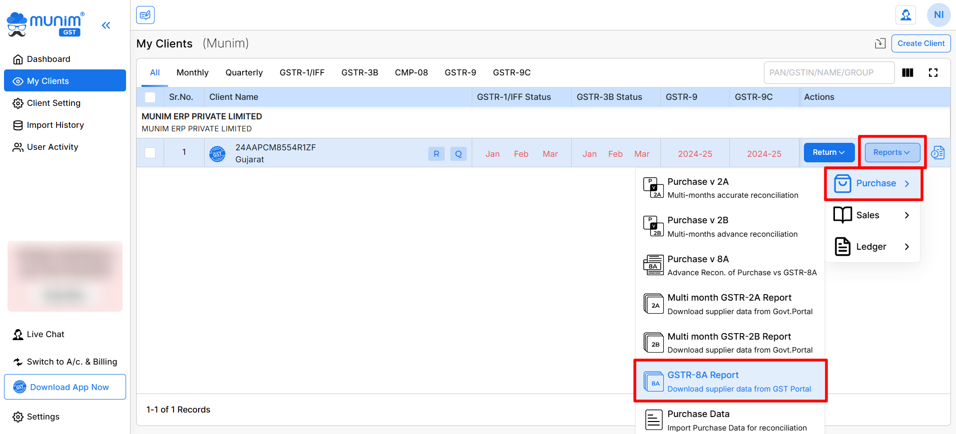 Munim provides two options to download GSTR-8A data from the GST Portal:
