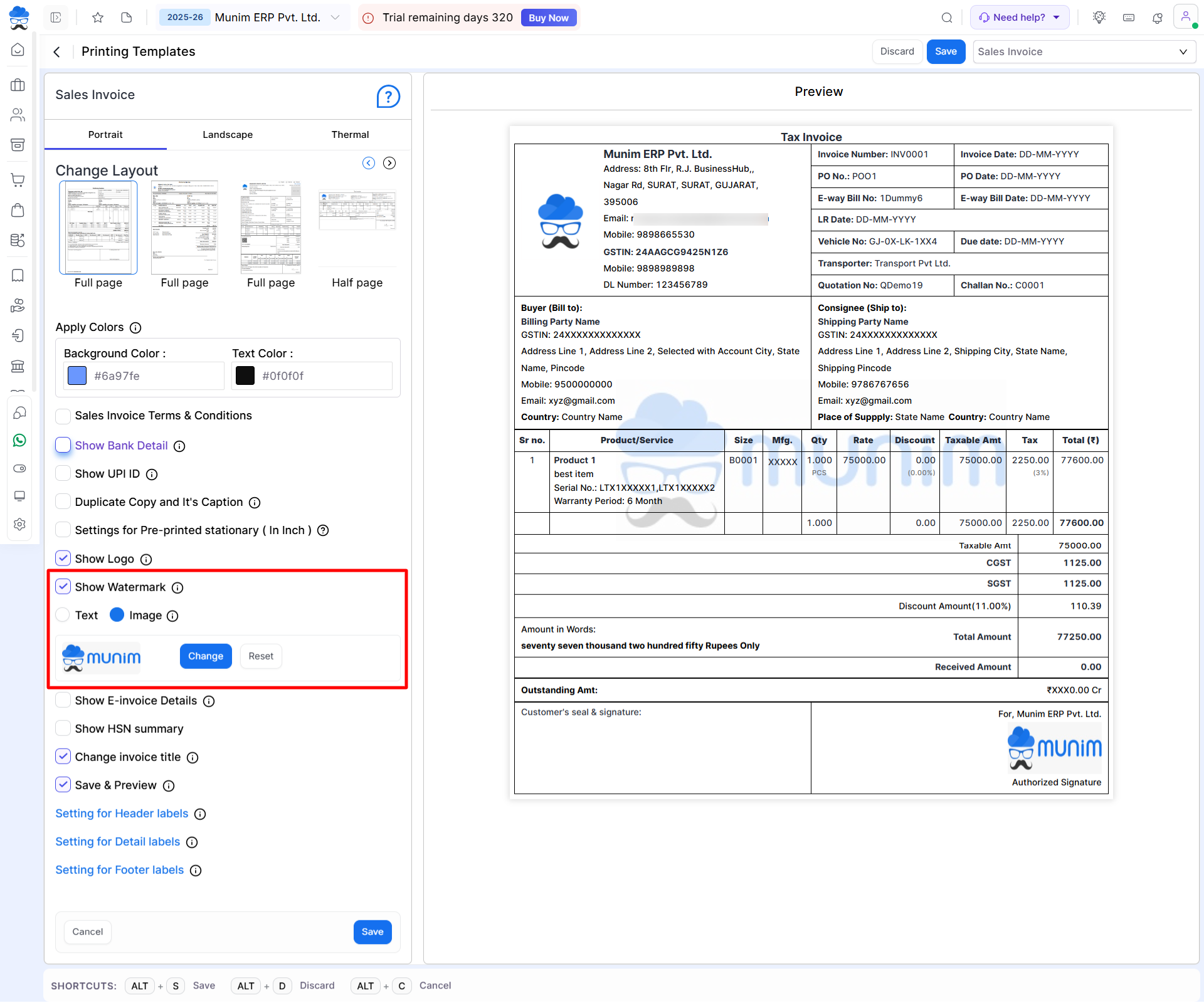 Munim allows you to set a Watermark in your Invoice prints as per your requirement to enhance the visual appeal of your documents.
