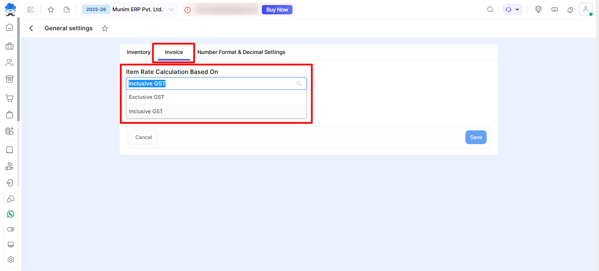 - Locate the “Item Rate Calculation” field within the Invoice section.