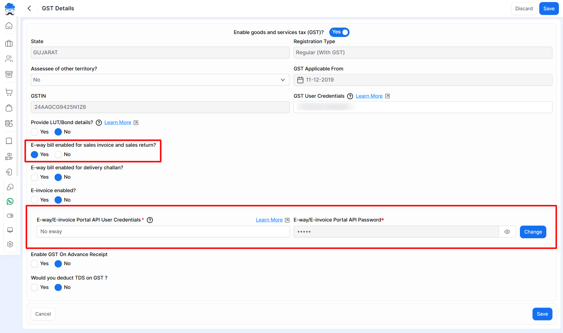 - Here enable Enable E-way Bill option and Provide the necessary Eway portal credentials and password.