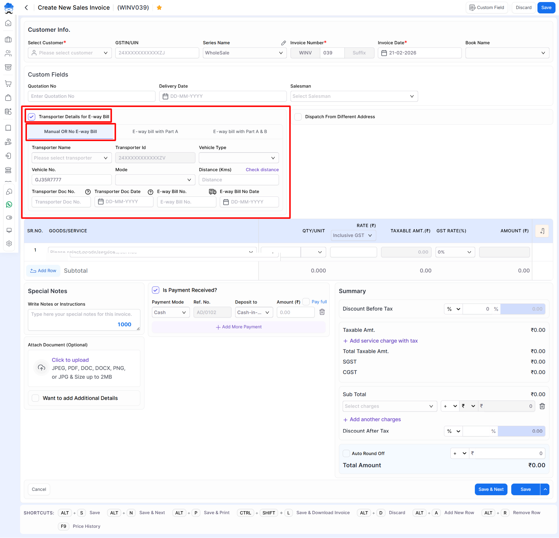 - After adding transport data like Vehicle Type, Vehicle No. and Mode, click Save.