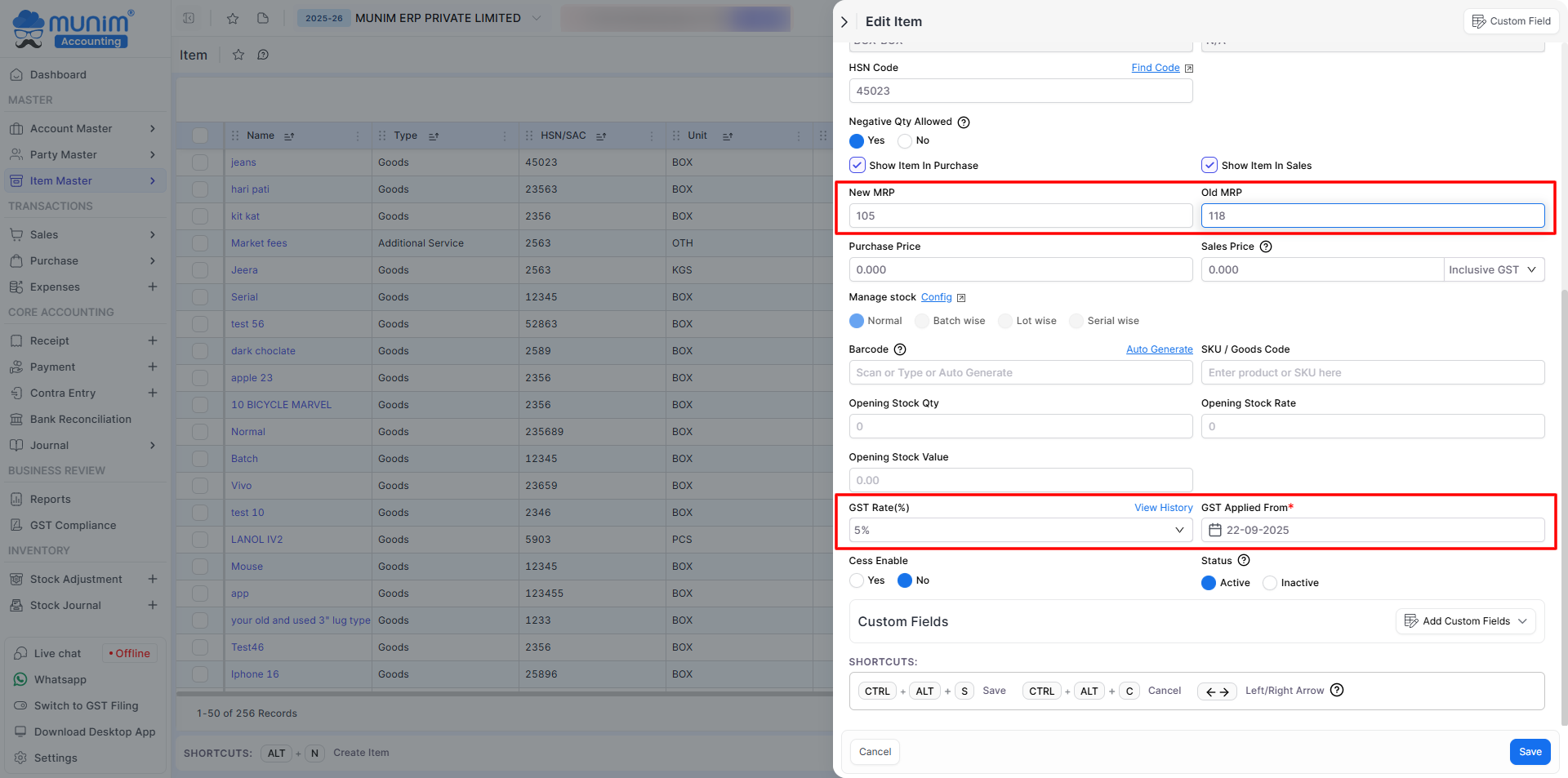 - Repeat the process for each item that requires a GST Rate and MRP update.