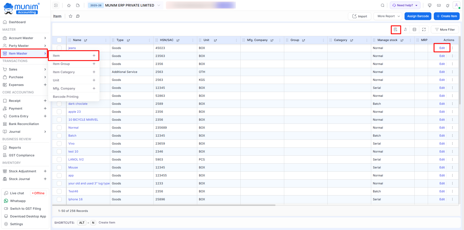 - You can also update GST rate and MRP data in bulk by going to Master > Item Master > Item.