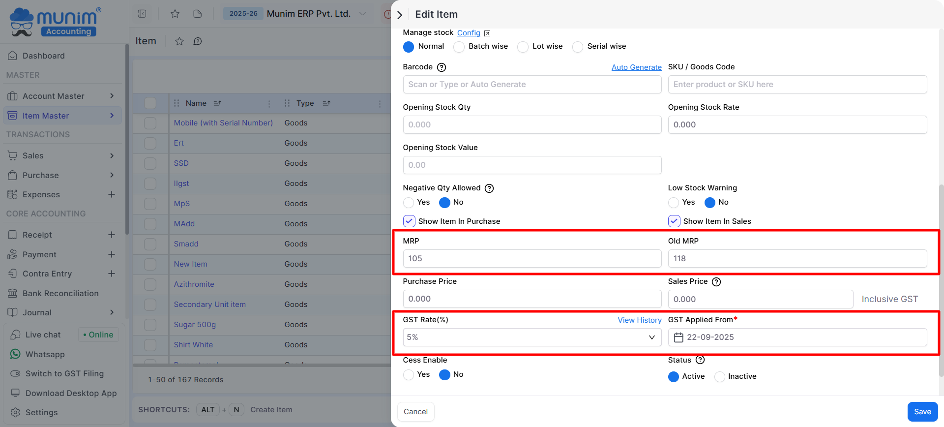 - Repeat the process for each item that requires a GST Rate and MRP update.