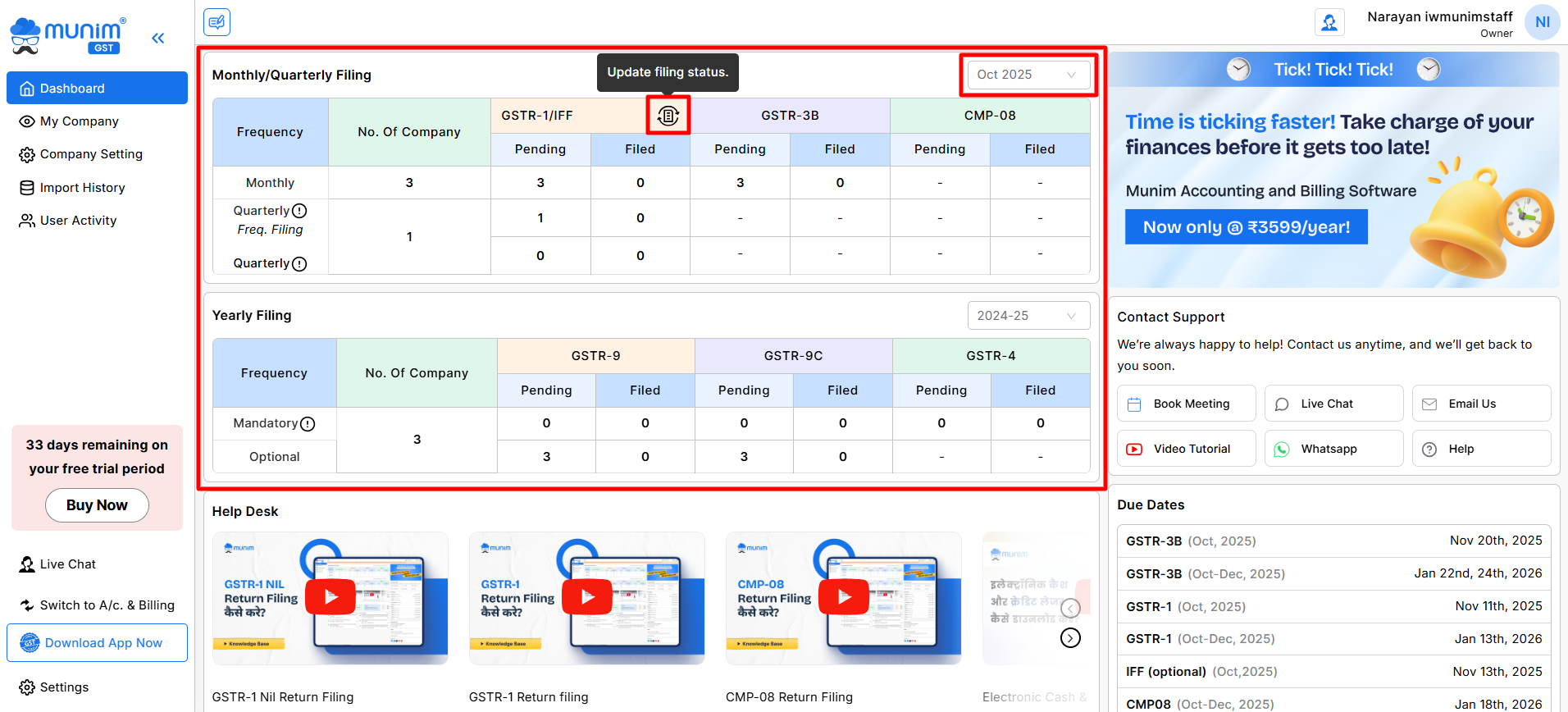 - Here you can select the Month and then click on the Update Filing Status option in each column to update statuses.