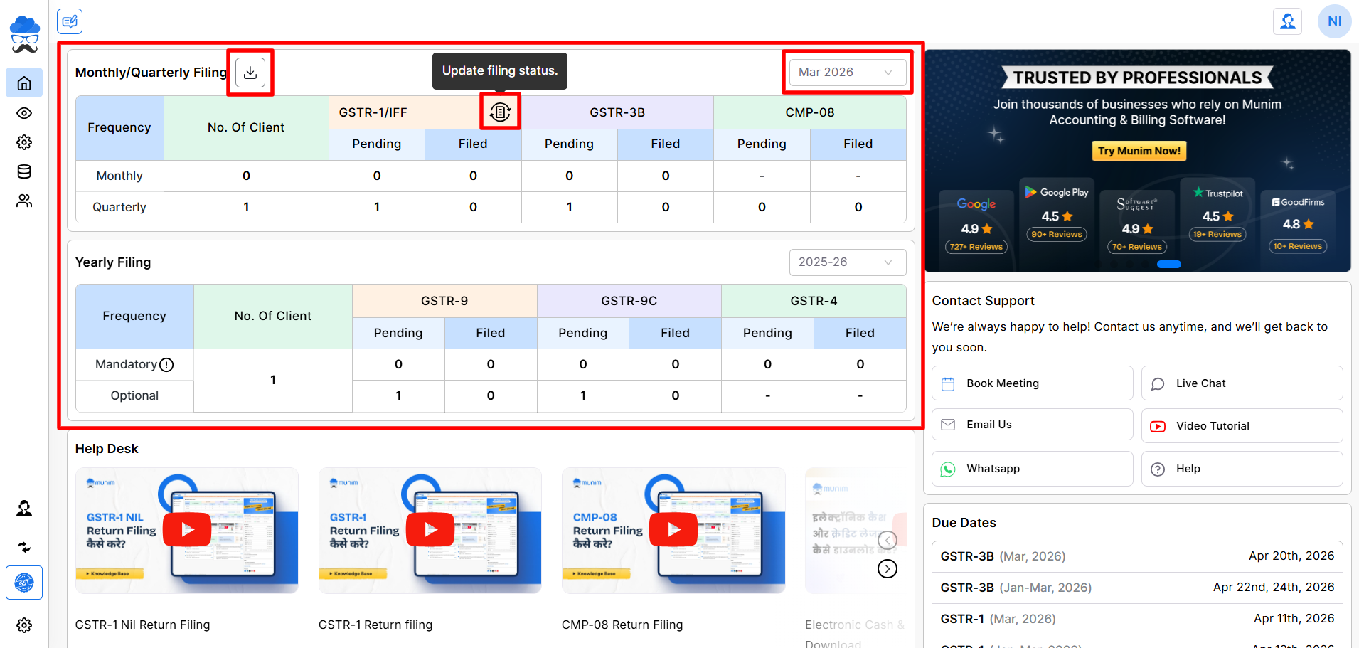 - Here you can select the Month and then click on the Update Filing Status option in each column to update statuses.