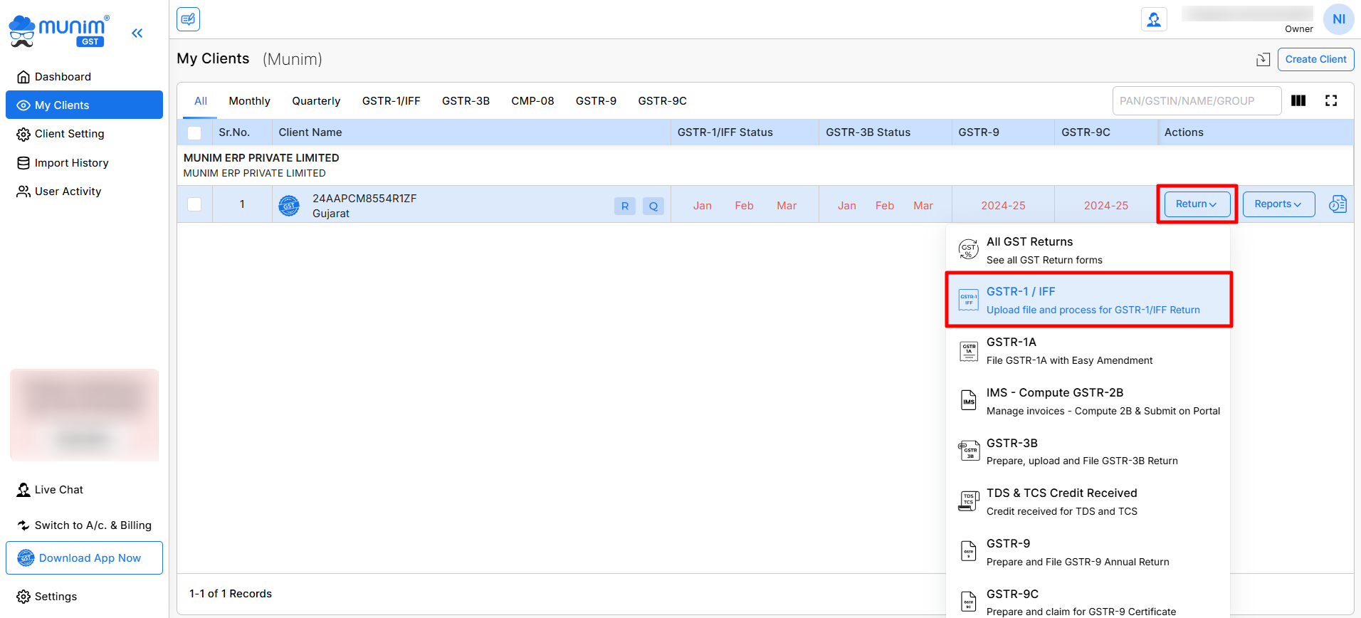 - Click on it to open the dropdown menu. From the dropdown, select the GSTR-1 option.