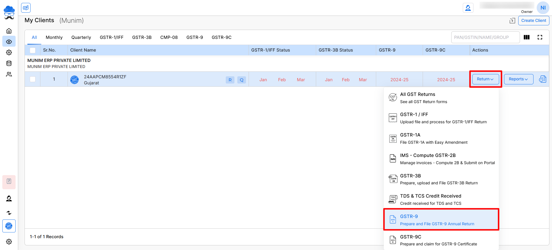 - First, go to the My Clients page and select the GSTR-9 option from the Return button of the client company.