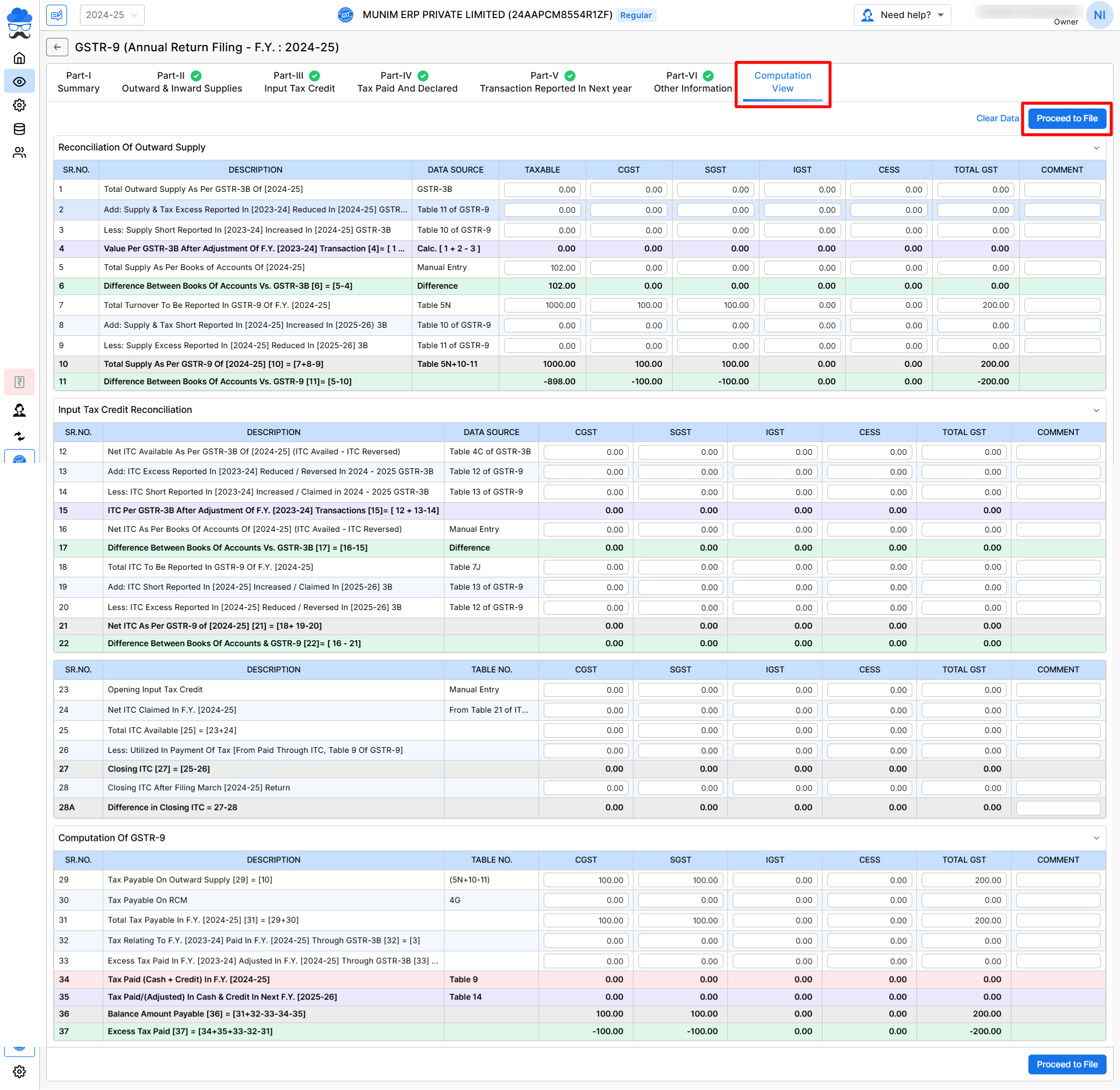 - Click on the Computation View tab, last in the section tabs, to check a summary of the total tax liability, ITC, and other figures.