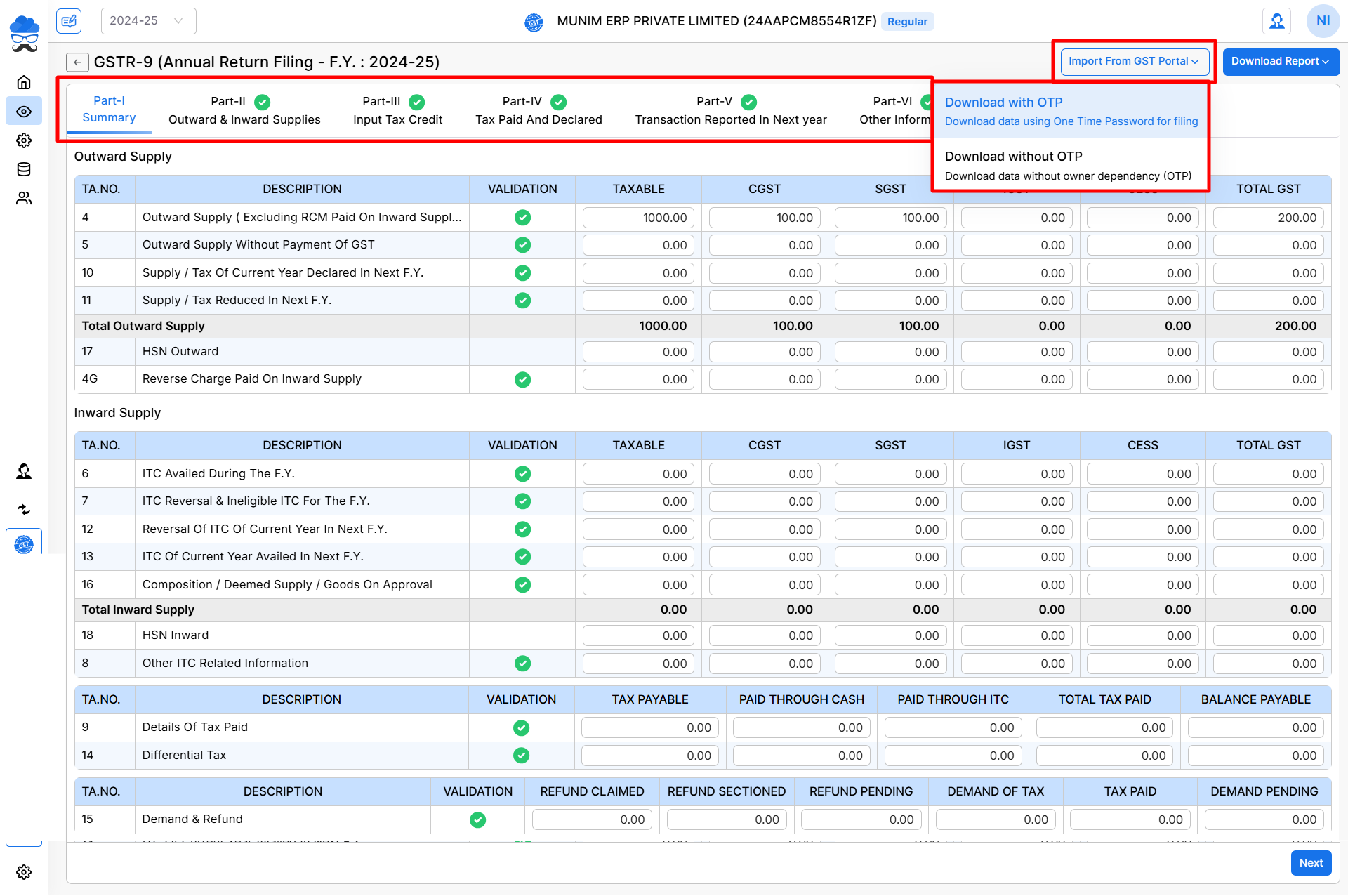 GSTR-9 is the annual return for GST-registered businesses, summarizing outward and inward supplies, input tax credit (ITC), and taxes paid during the financial year. The following steps guide you through the filing process in Munim.