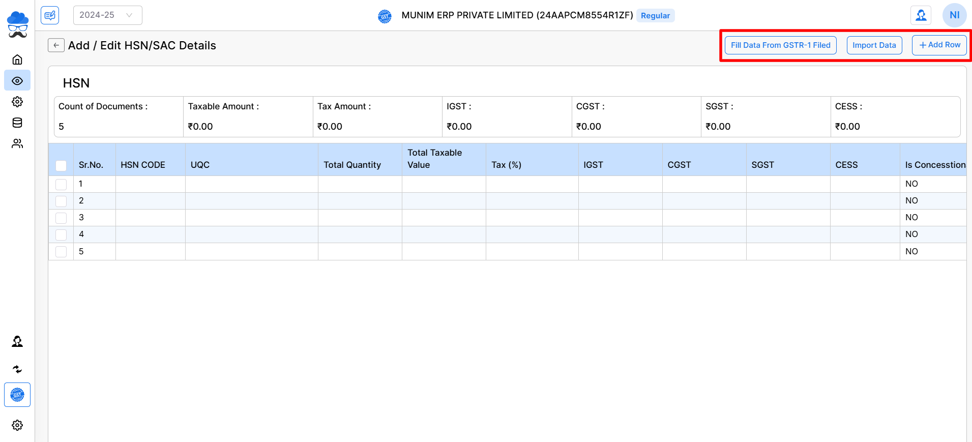 - On this page, you can retrieve this data from the GST portal by selecting the “Fill Data From GSTR-1 Filed” button. You may also upload the data in Excel format using the Import Data button.