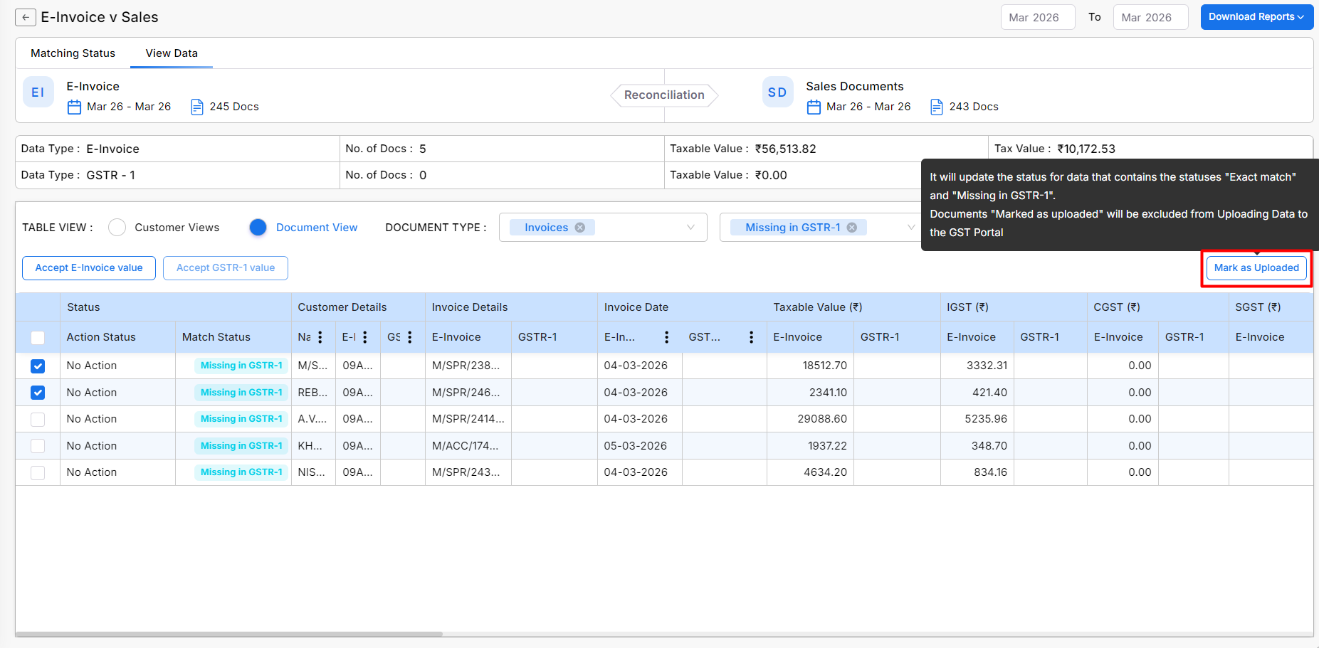 - This will prevent Exact Match and Missing in GSTR-1 invoices from being uploaded to the portal again.