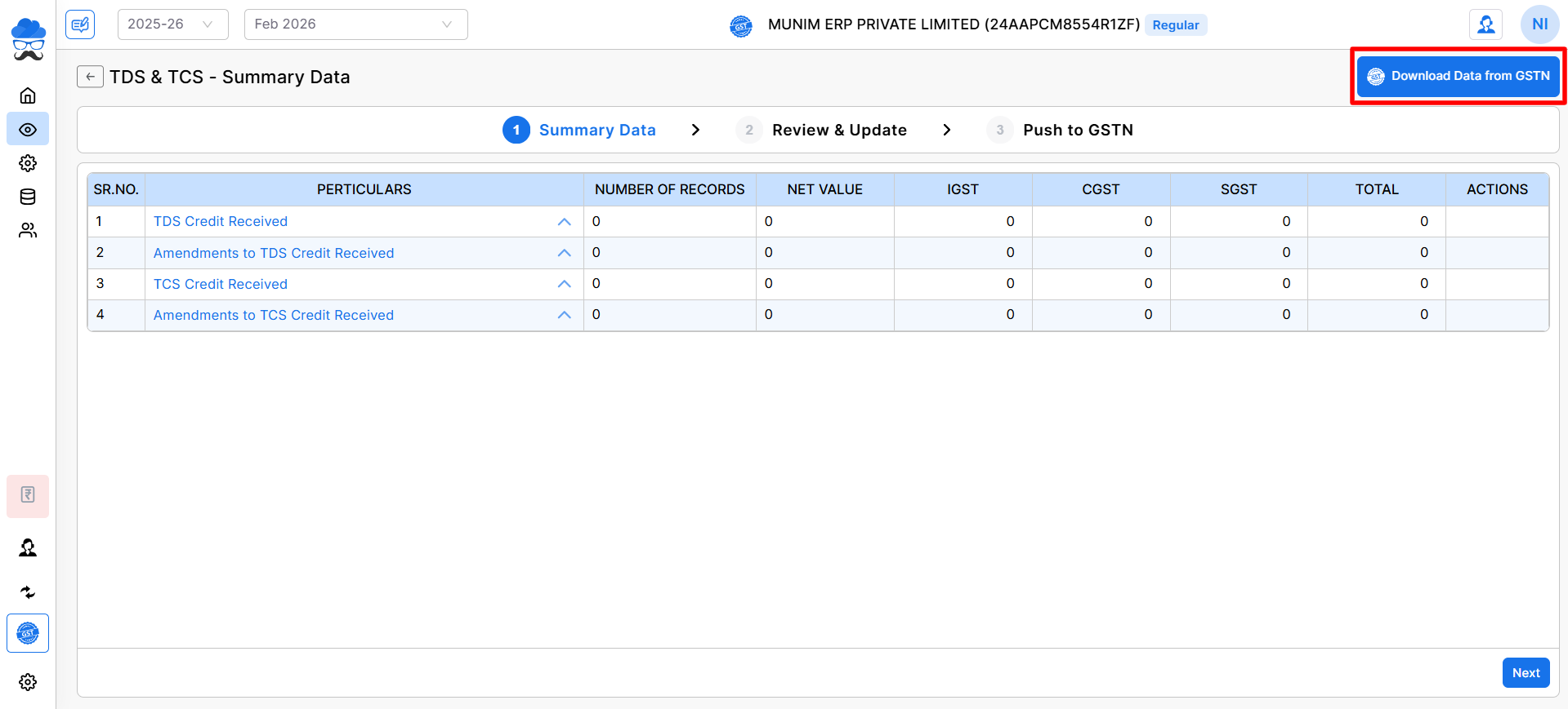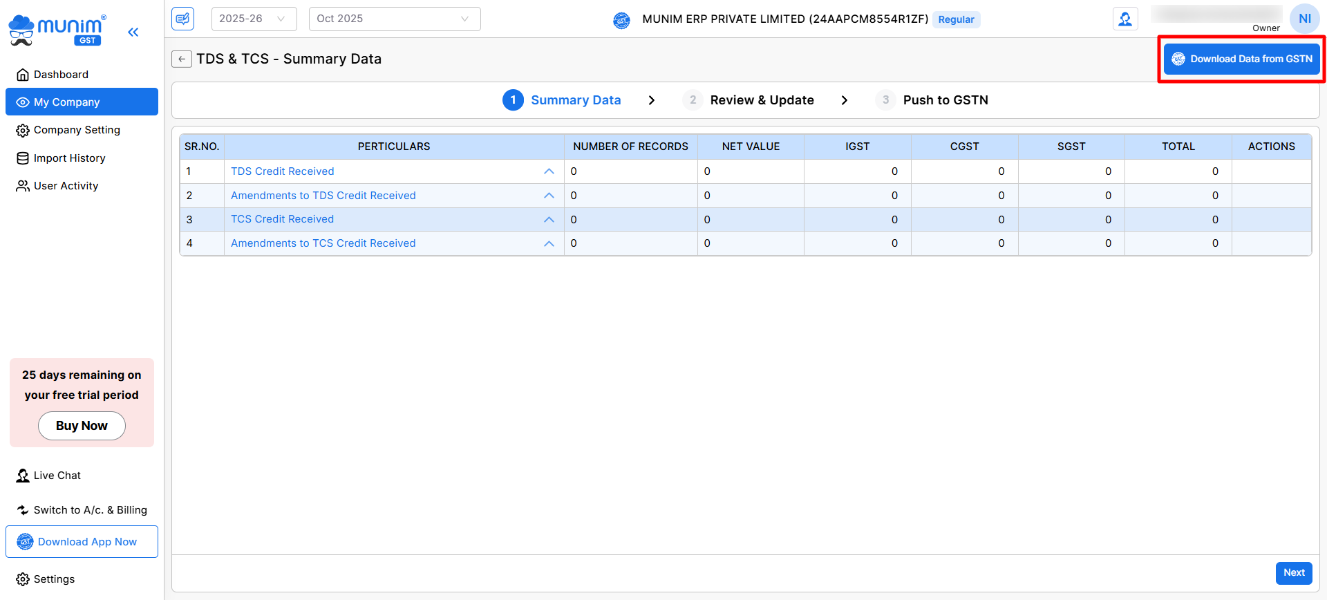 - Start by fetching the TDS & TCS data directly from the GSTN portal by clicking the Download Data from GSTN button from the top right.
