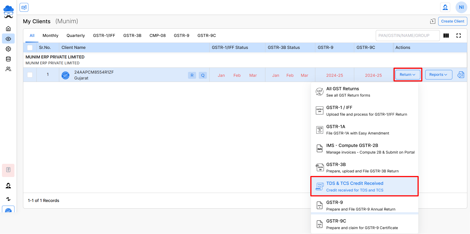 - First, go to the My Clients module, here on the company list, click on the Return button and then click the TDS & TCS Credit Received option.