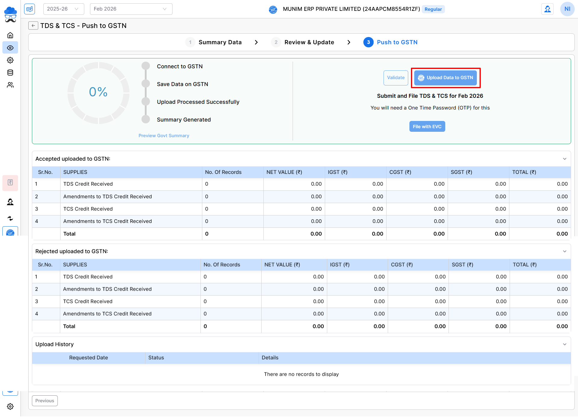 - Click the “Upload Data to GSTN” button to submit the updated TDS/TCS data to the GSTN portal.