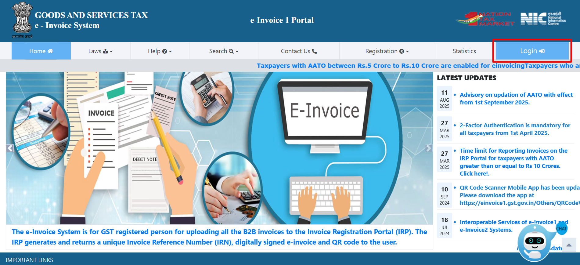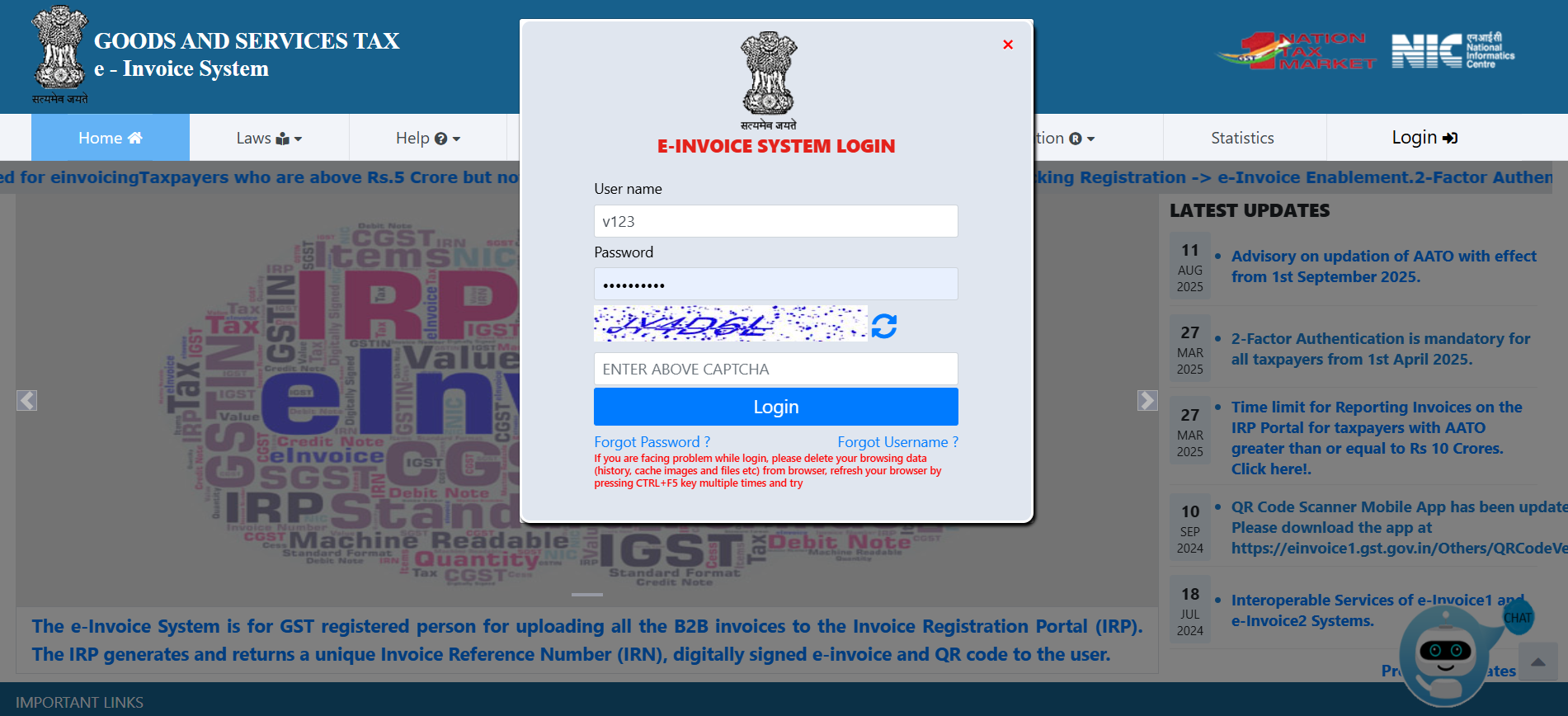 - Access to the https://einvoice1.gst.gov.in/ for the E-Invoice Portal.
