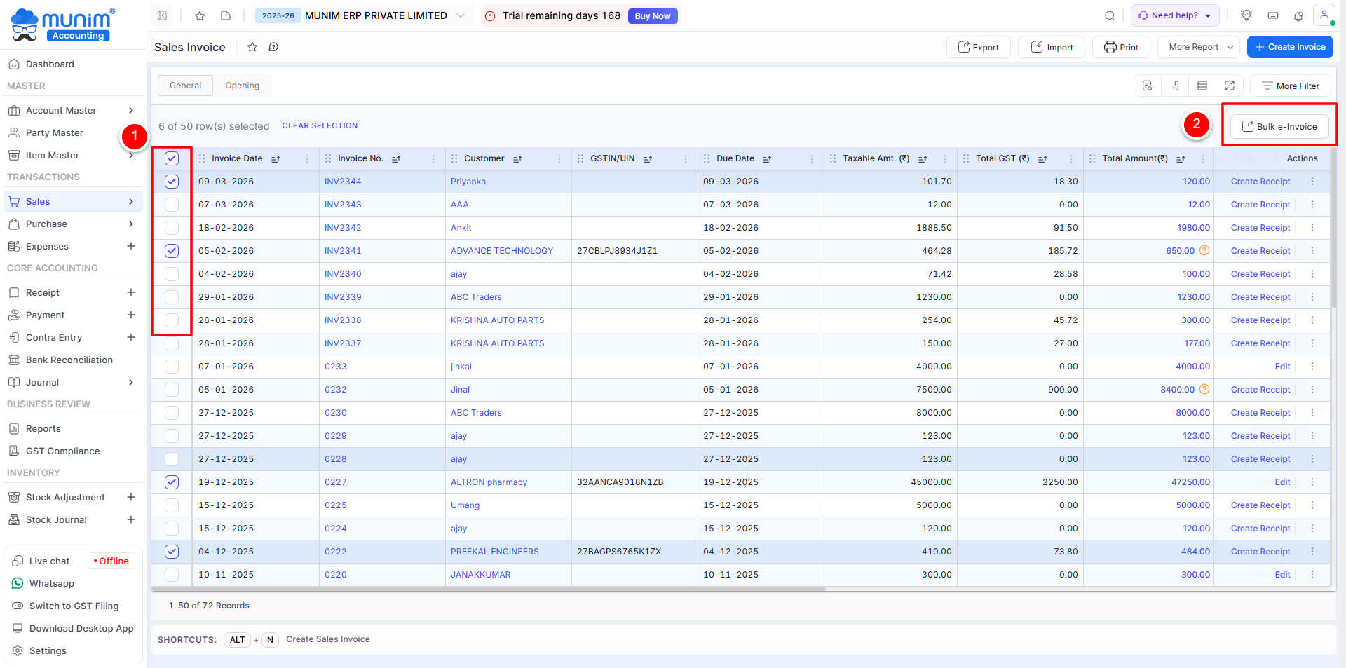 Follow the below steps to generate bulk e-invoices in the Munim app: