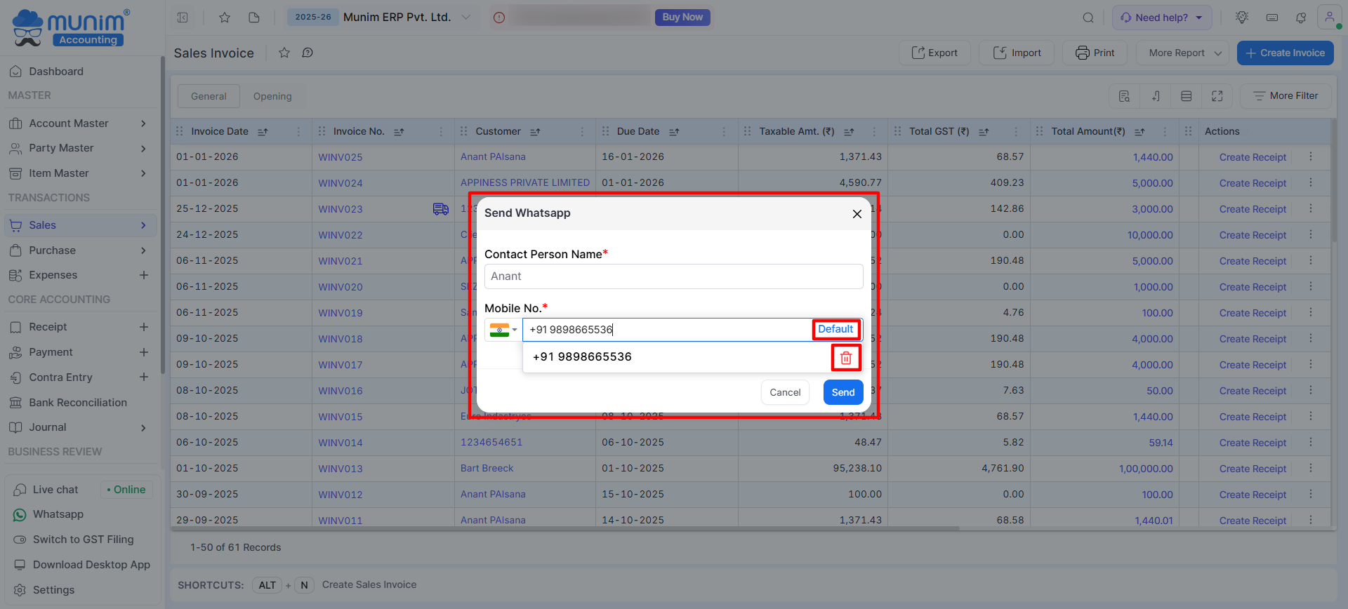 - Mobile number is fetched from Party Master. You can change it while sending and make them default.