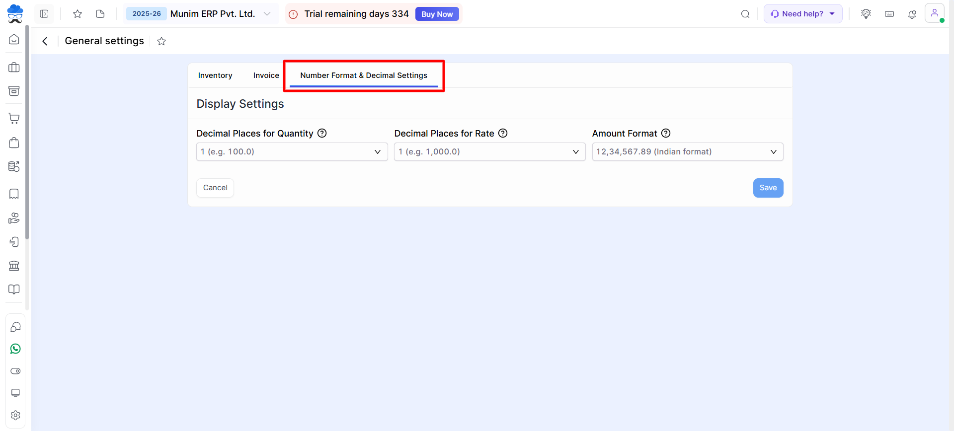 - To modify the decimal settings for item quantity and rate values, users must submit a request to the Support team to enable this feature.