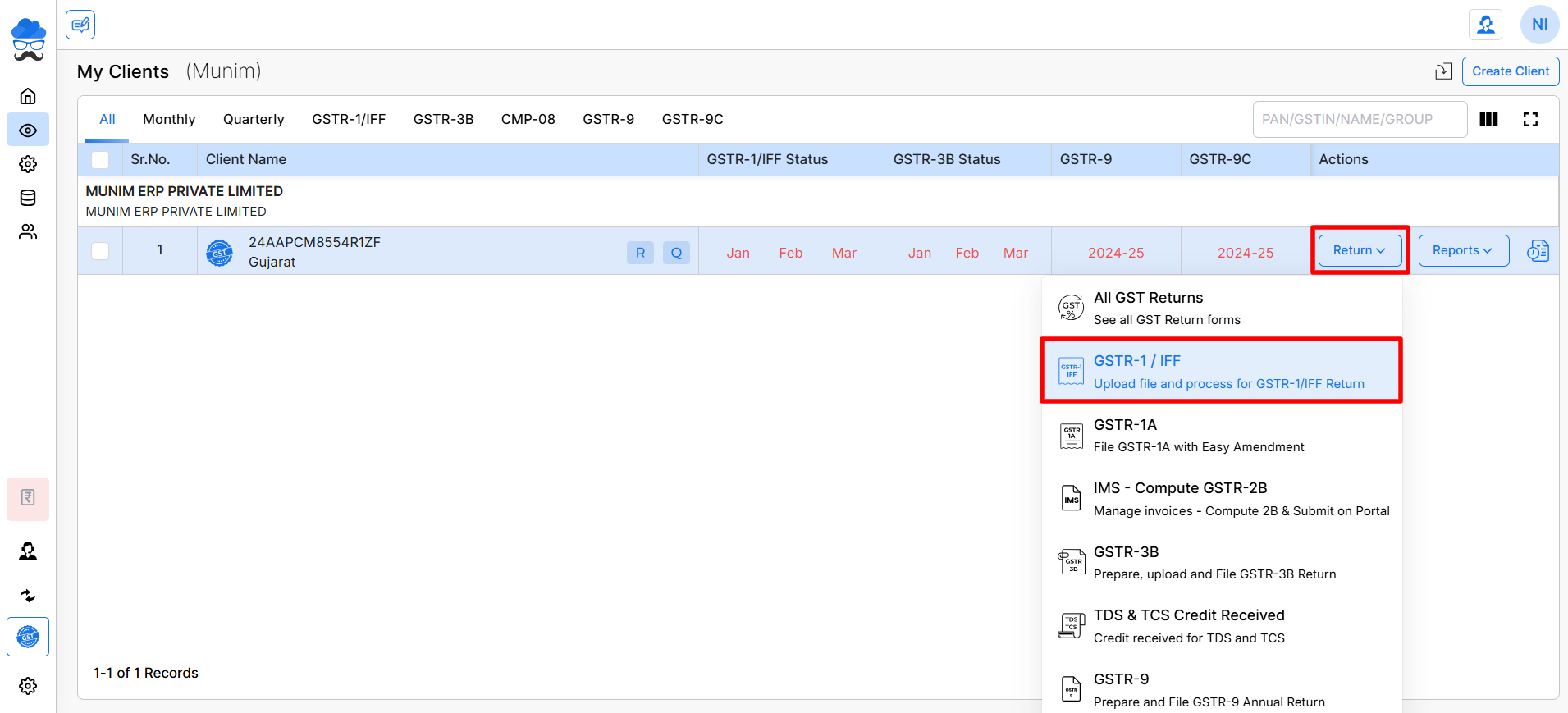 - Click on the Return button and choose the “GSTR1/IFF” option for the required client company.