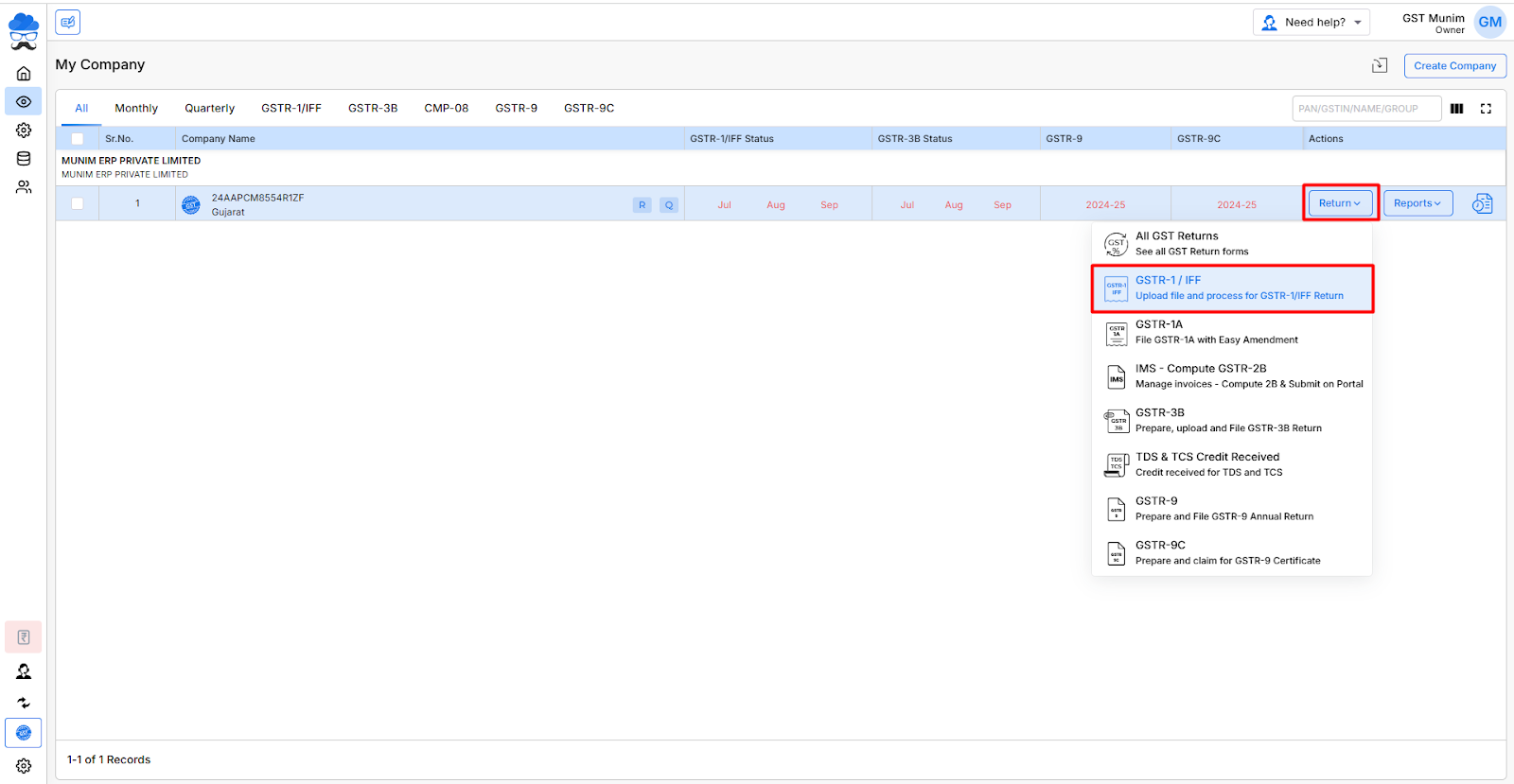 - Click on the Return button and choose the GSTR-1/IFF option.