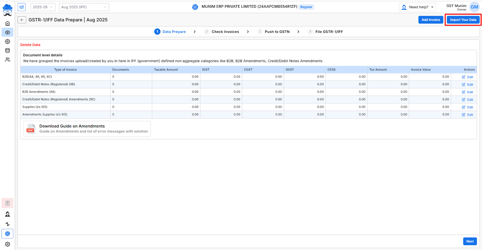 - On the GSTR-1 Data Prepare page, click the Import Your Data button located in the top right corner.