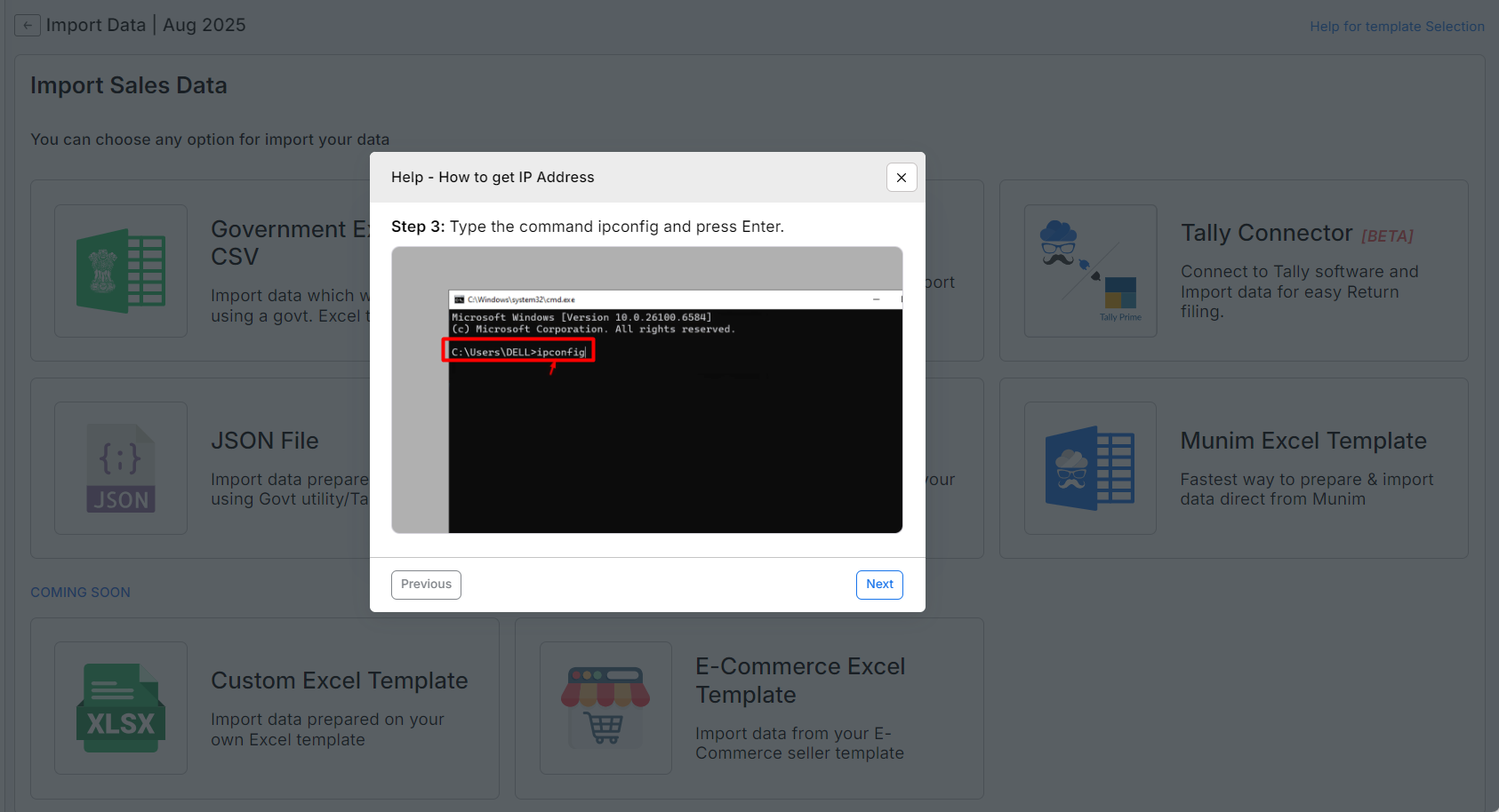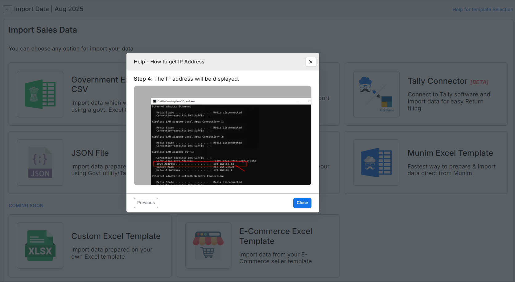 - A pop-up will appear for the Tally Connector. Enter your system’s IP Address and the Port Number configured in Tally Prime.