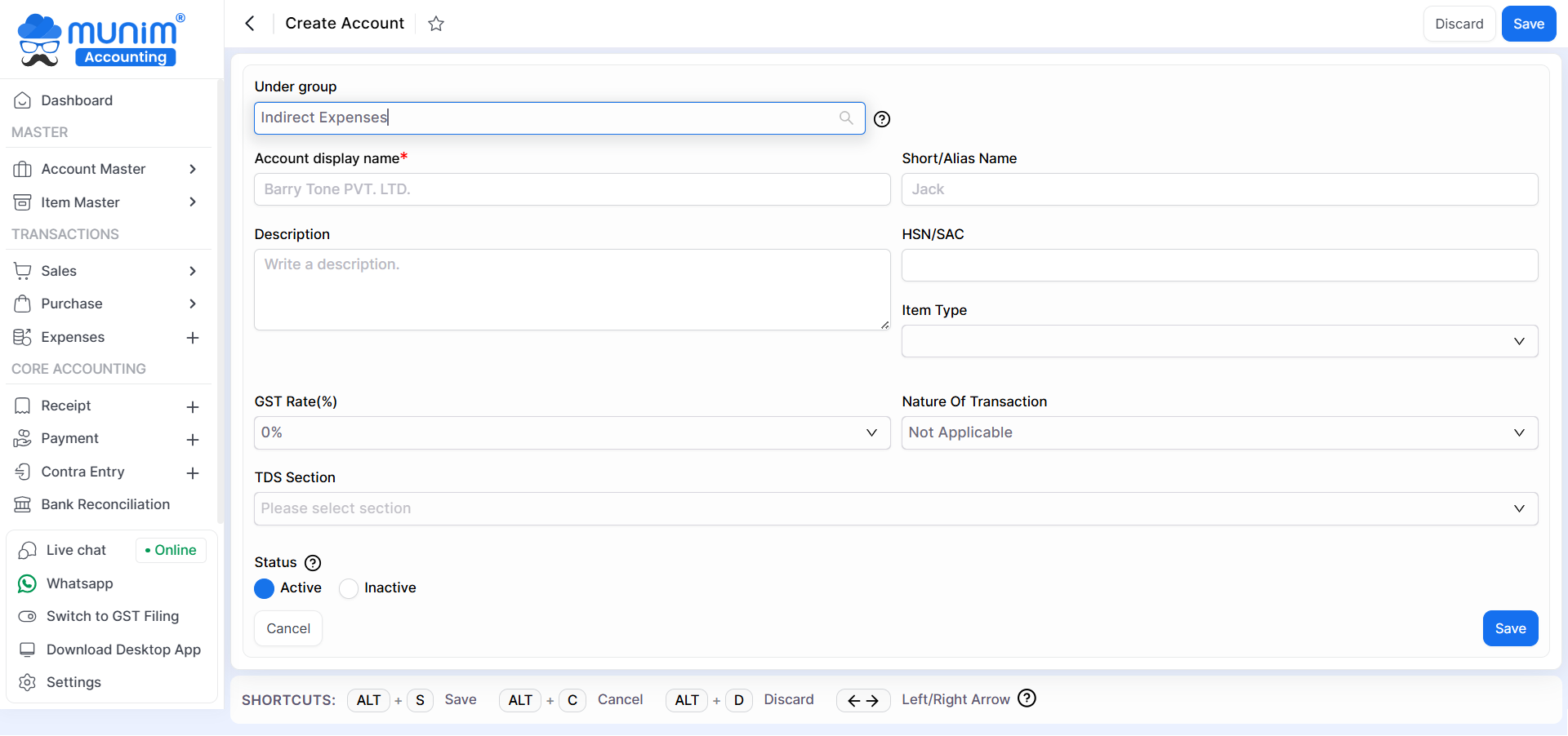 Here you are adding your Indirect Expenses ledger to Munim.