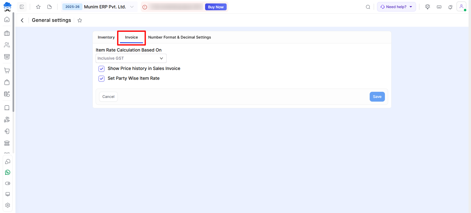 Here you can see a Invoice tab, where you can find various settings regarding Item Rate calculation, PO Details in Invoice and Delivery challan and Price history settings.