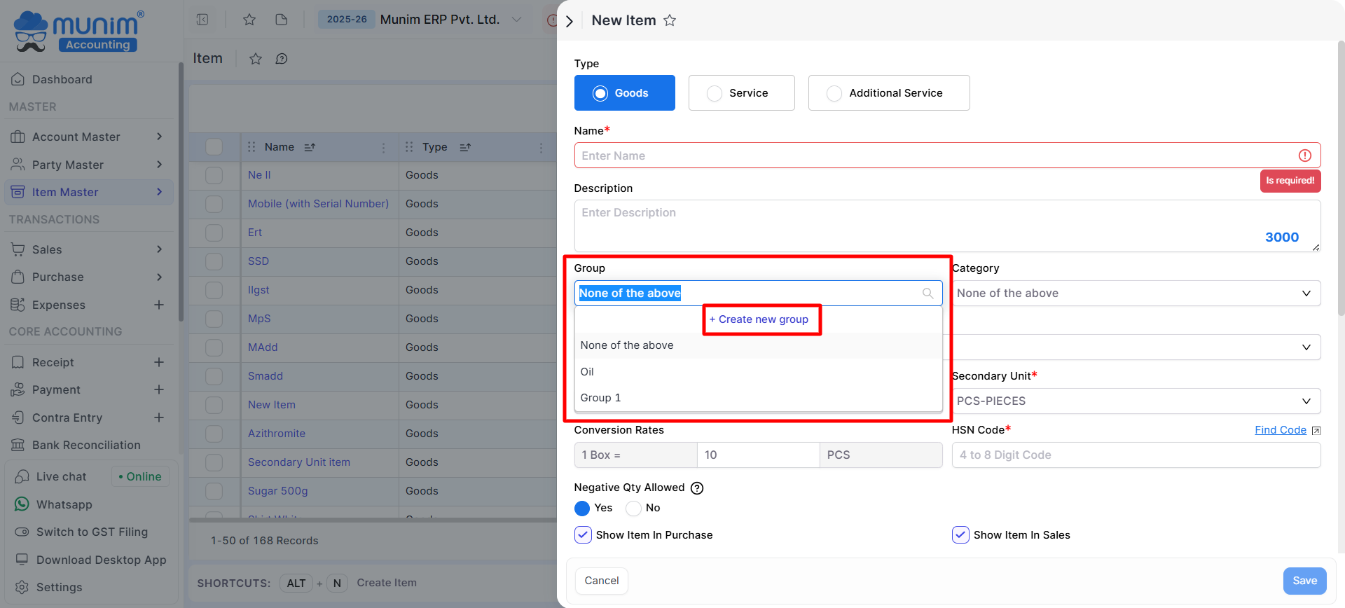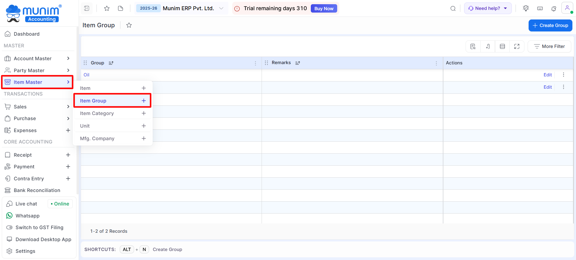 - Go to the Item Master module in the Master section, then click Item Group option in the left sidebar.