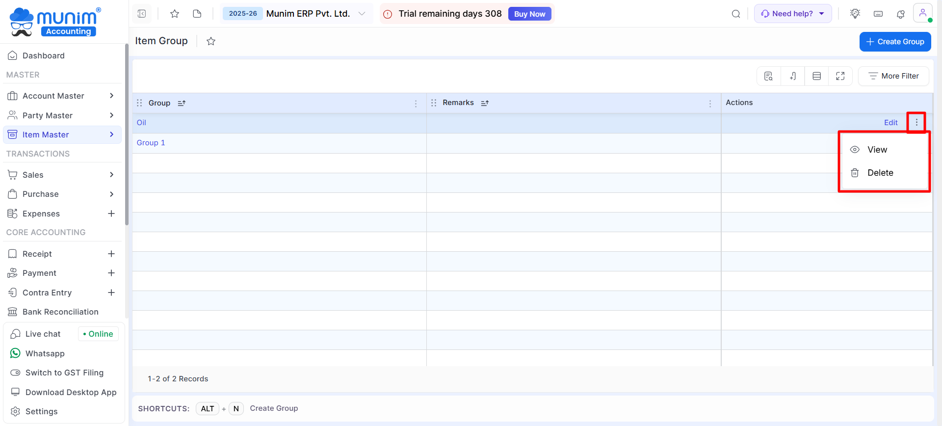 - Once the Item Group name is created, it will be available on the list page with the View and Delete options in the Action menu.