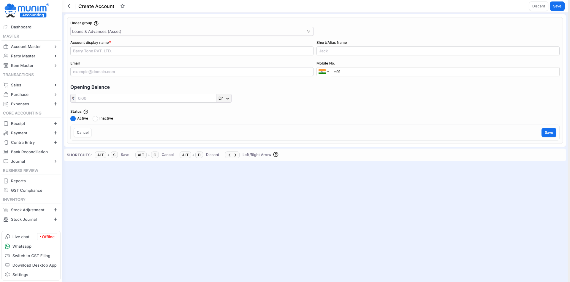 | Under group | Here select the Loan & Advance(Asset) account. | |